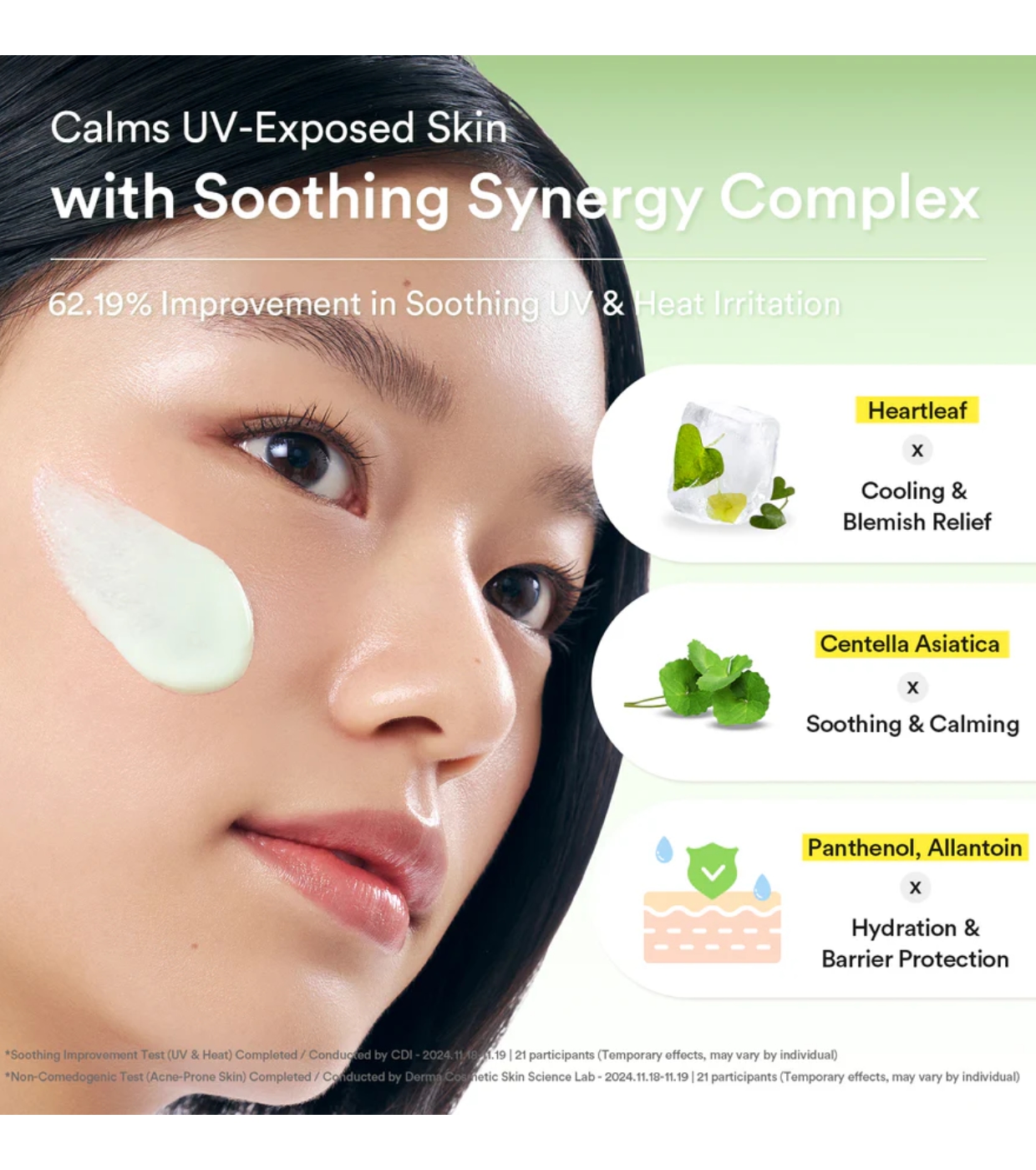 Water, Zinc Oxide (CI 77947), Butyloctyl Salicylate, Propylheptyl Caprylate, Propanediol, C15-19 Alkane, Disiloxane, Isododecane, Cetyl Diglyceryl Tris(Trimethylsiloxy)silylethyl Dimethicone, Caprylyl Methicone, Isopropyl Myristate, Sodium Chloride, Triethylhexanoin, Glycerin, Disteardimonium Hectorite, Methyl Methacrylate Crosspolymer, Polymethylsilsesquioxane, 1,2-Hexanediol, Triethoxycaprylylsilane, Dipentaerythrityl Tri-Polyhydroxystearate, Houttuynia Cordata Extract, Lauryl Dimethicone/Polyglycerin-3 Crosspolymer, Polyglyceryl-2 Dipolyhydroxystearate, Panthenol, Caprylyl Glycol, Glyceryl Caprylate, Melia Azadirachta Leaf Extract, Melia Azadirachta Flower Extract, Butylene Glycol, Coccinia Indica Fruit Extract, Amber Powder, Dipropylene Glycol, Solanum Melongena (Eggplant) Fruit Extract, Curcuma Longa (Turmeric) Root Extract, Ocimum Sanctum Leaf Extract, Tocopherol, Corallina Officinalis Extract, Moringa Oleifera Seed Oil, Sodium Citrate, Lecithin, Sodium Hyaluronate, Allantoin, Dipotassium Glycyrrhizate, Sodium PCA, Arginine, Ceramide NP, Erythritol, Asiaticoside, Madecassic Acid, Asiatic Acid, Centella Asiatica Extract, Pentylene Glycol, Octanediol.