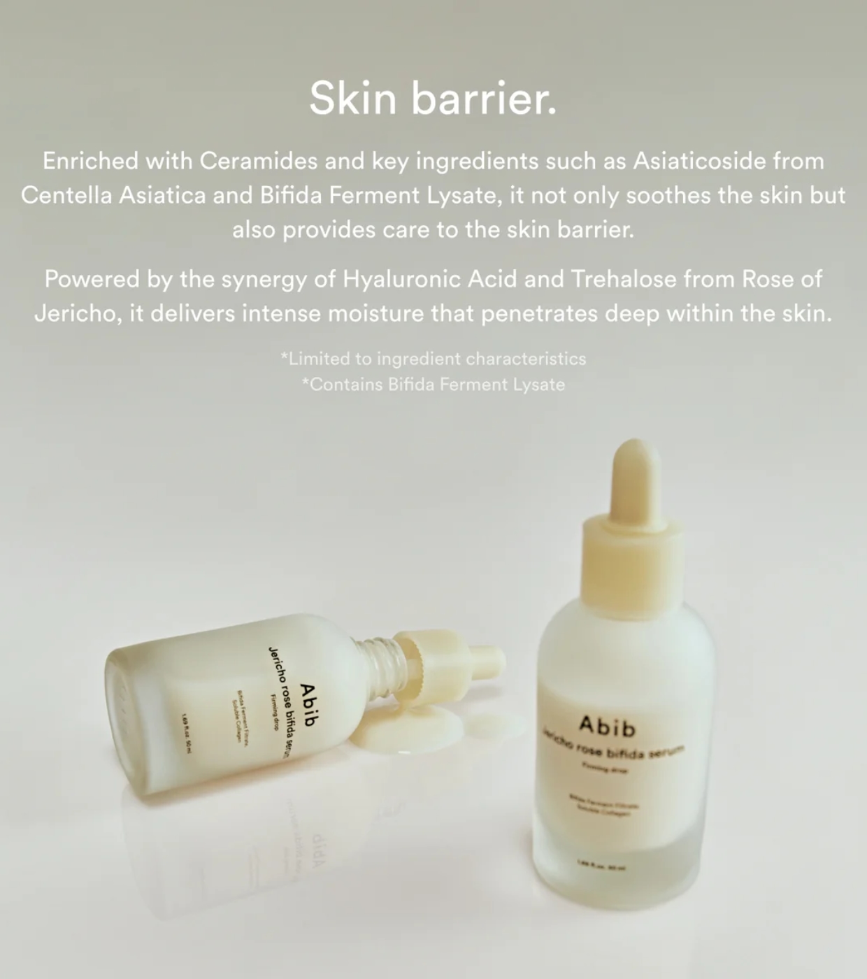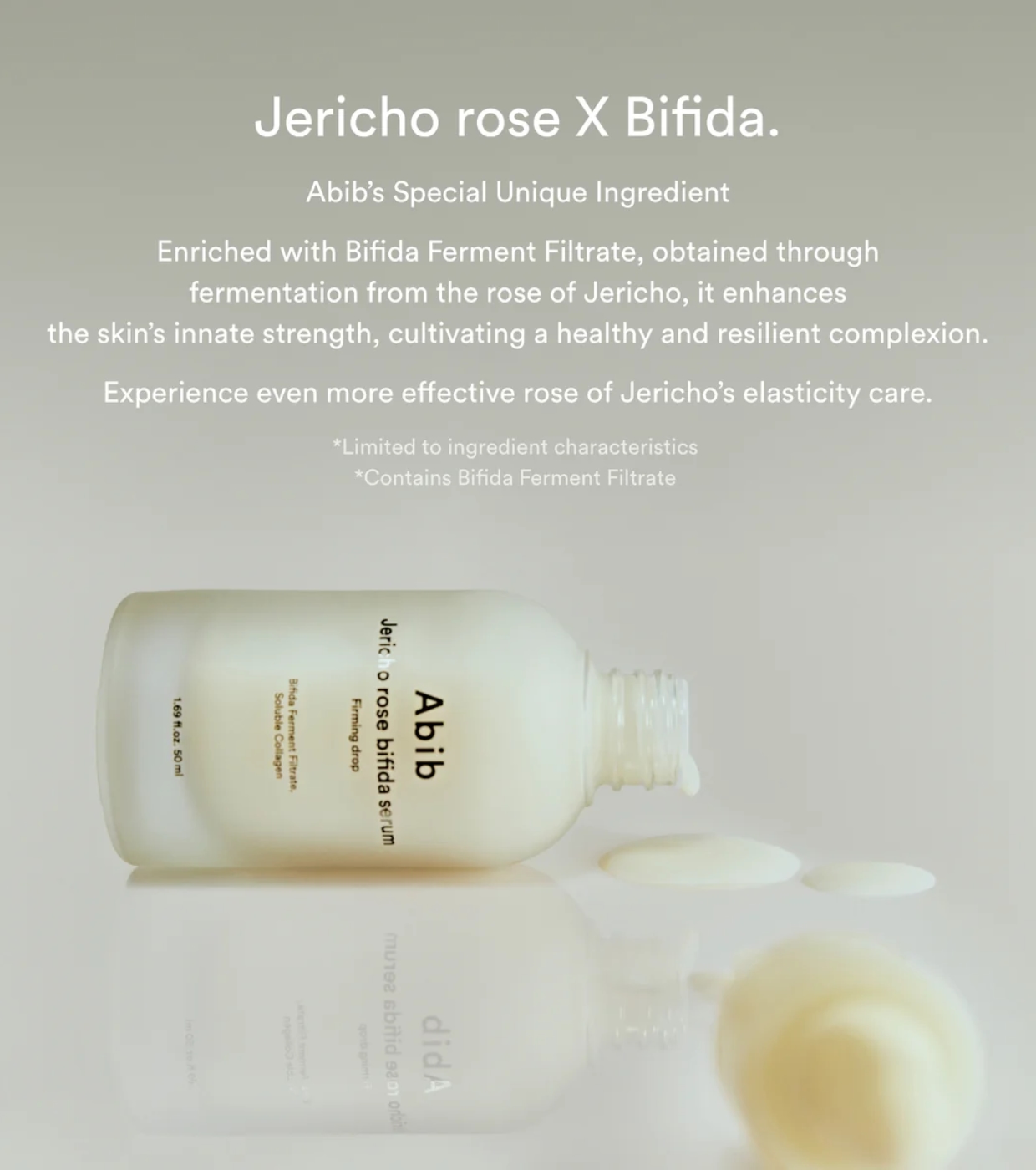 Découvrez des soins du visage avancés avec ce sérum raffermissant à absorption rapide Jericho Rose Bifida de Abib , conçu pour améliorer l'élasticité, réduire l'apparence des pores et garder la peau intensément hydratée.