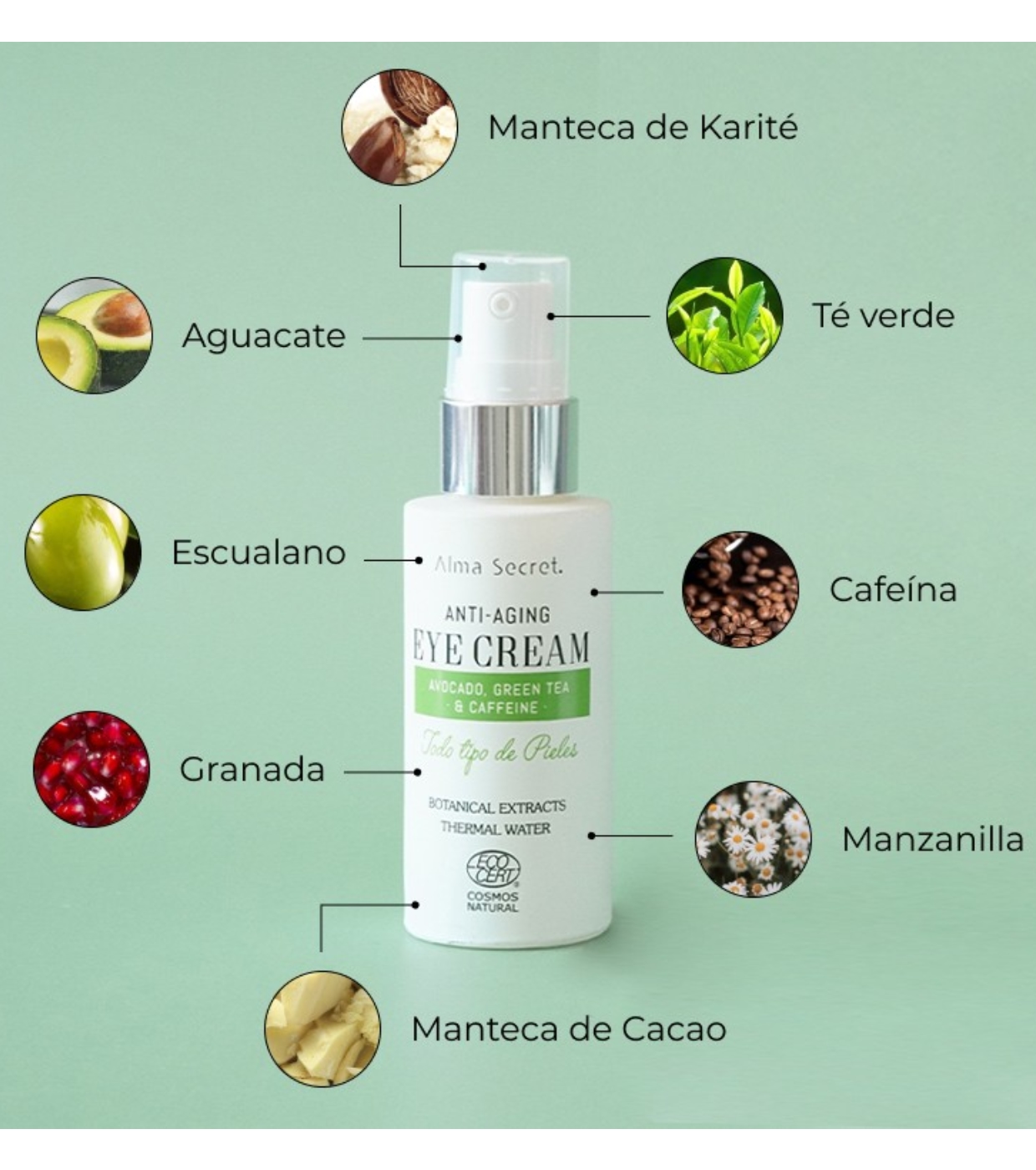 La crème contour des yeux multi-réparatrice et anti-âge à l'avocat, au thé vert et à la caféine d'Alma Secret possède une formule naturelle puissante pour combattre les signes de vieillissement et de fatigue autour des yeux.