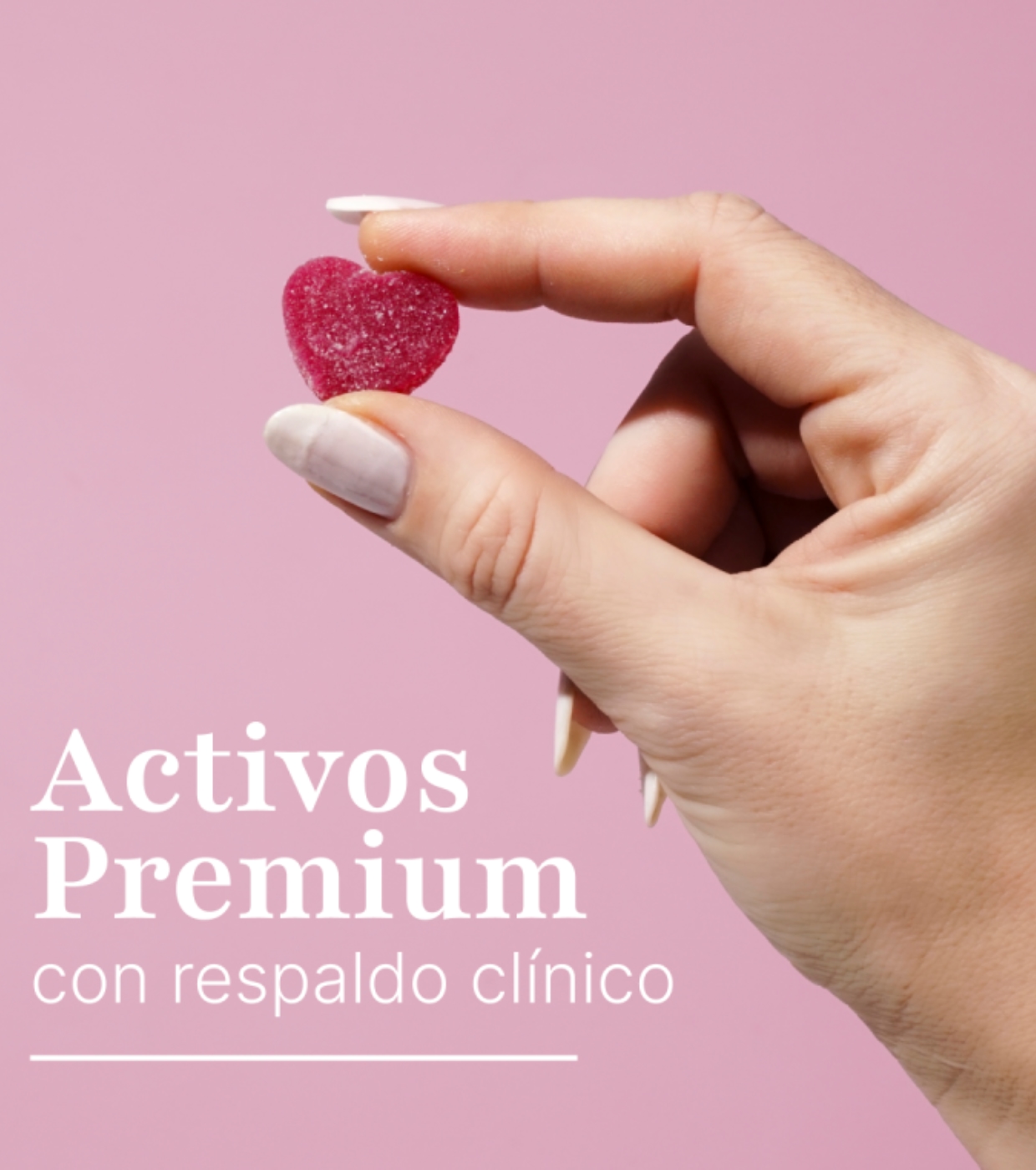 Edulcorante: Jarabe de maltitol; agua osmotizada, edulcorantes sorbitol, maltitol plv; L-Metionina, L-Cisteína, espesante: pectina; E.S de brotes de guisantes en polvo - AnaGainTM Un (Pisum sativum, Brotes orgánicos, Isomaltosa), E.S. Acerola [(Malpighia punicifolia L., fruto, Maltodextrina), 25% Vitamina C], E.S. Bambú [(Bambusa arundinacea (Retz.) Willd, Brote (tallos florales, hojas y tallo principal), Maltodextrina) 70% silice] E.S. Saw Palmetto (Serenoa repens, baya, maltodextrina), Acidulante: ácido cítrico; Aroma natural, Aroma natural (Edulcorante), Vitamina B3 (Nicotinamida), Colorante (concentrados de frutas y vegetales), Acidulante: citrato de sodio; Citrato de zinc, Edulcorante: Sucralosa, Vitamina B5 (D-Pantotenato cálcico), Vitamina B8 (Biotina), Selenio (Selenito de sodio). Recubrimiento: edulcorante: maltitol plv. Contiene edulcorantes.