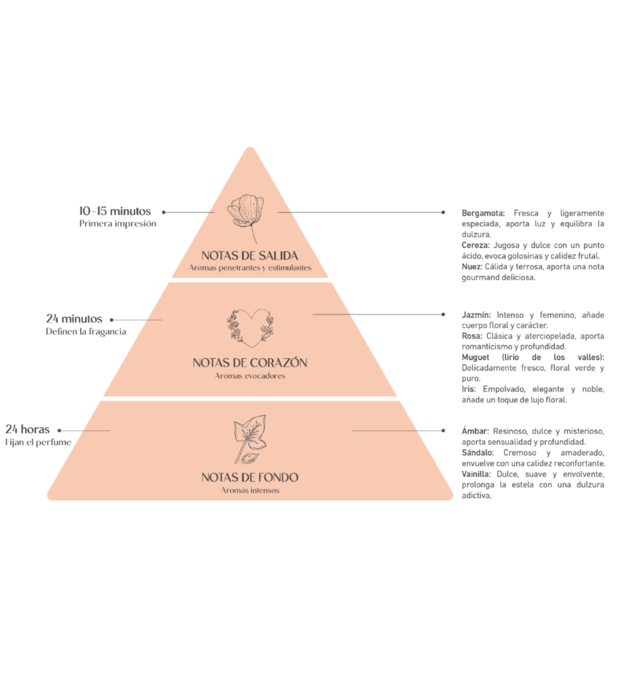 Le cœur floral et poudré apporte des nuances élégantes et féminines, tandis que le fond ambré et vanillé enveloppe l'espace d'un sillage crémeux, sensuel et persistant, qui reste dans l'air comme un murmure chaud.