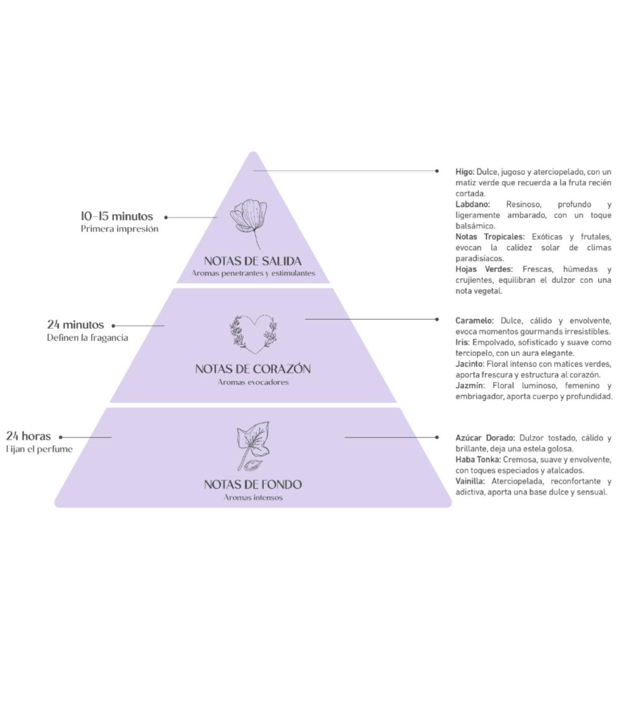 La figue mûre, juteuse et veloutée se mêle à un cœur de caramel et à des notes florales, tandis que le fond de vanille et de fève tonka dévoile une onctuosité crémeuse et addictive qui invite à la détente et au ressourcement.