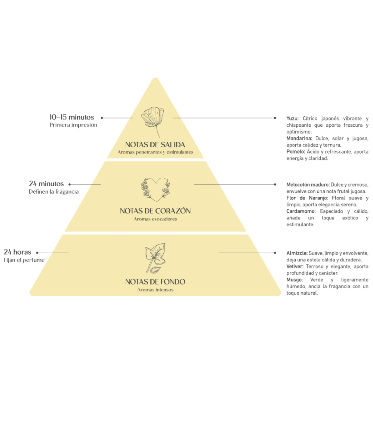 Le yuzu japonais, vif et rafraîchissant, se marie à la douceur veloutée de la pêche, créant une atmosphère positive, réconfortante et stimulante qui contribue à soulager le stress et à améliorer l'humeur.