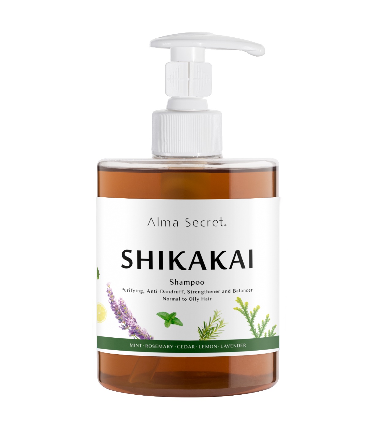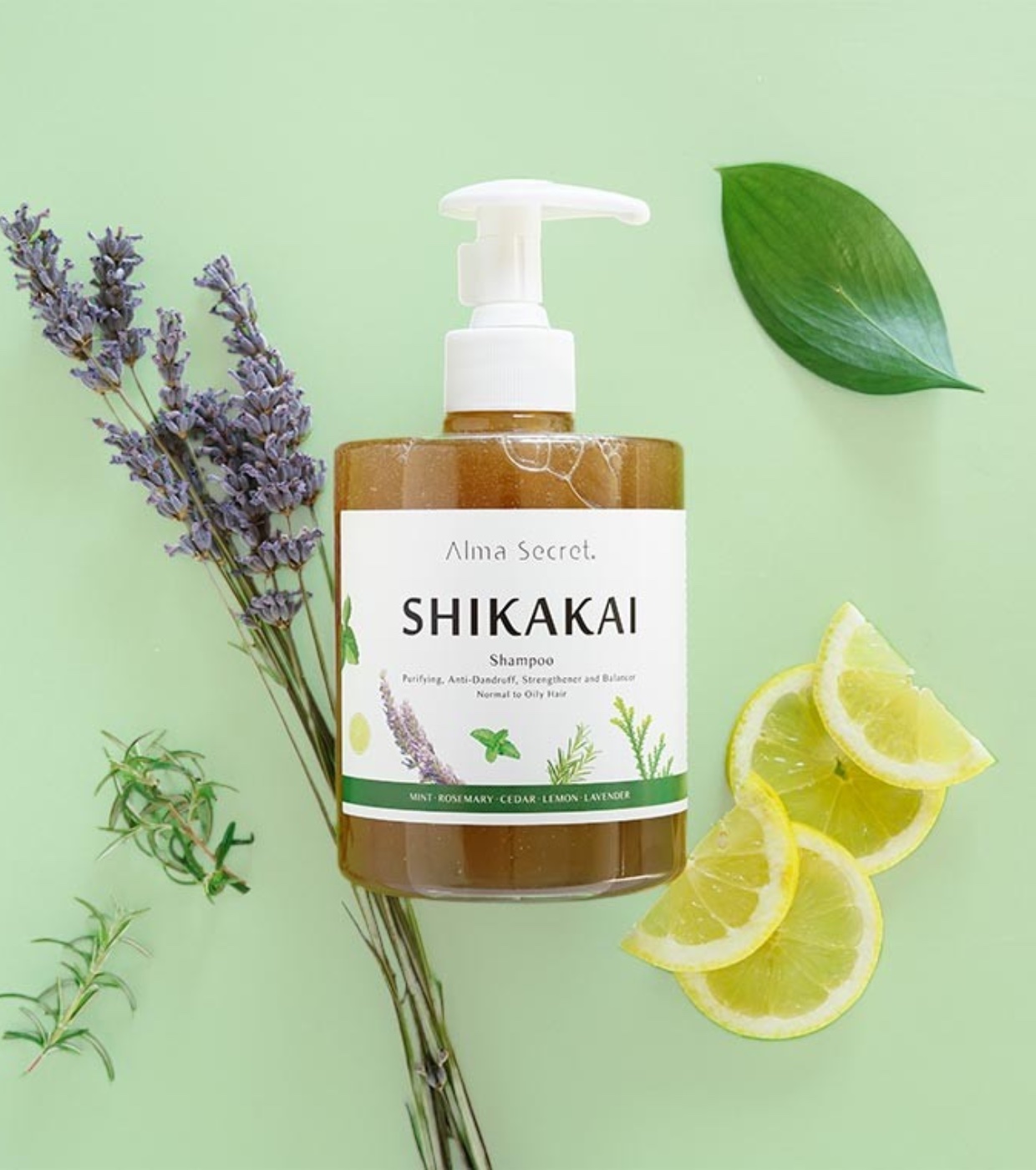 Shampooing Shikakai à l'ortie, la spiruline, la menthe, le romarin, le cèdre, le citron et la lavande.