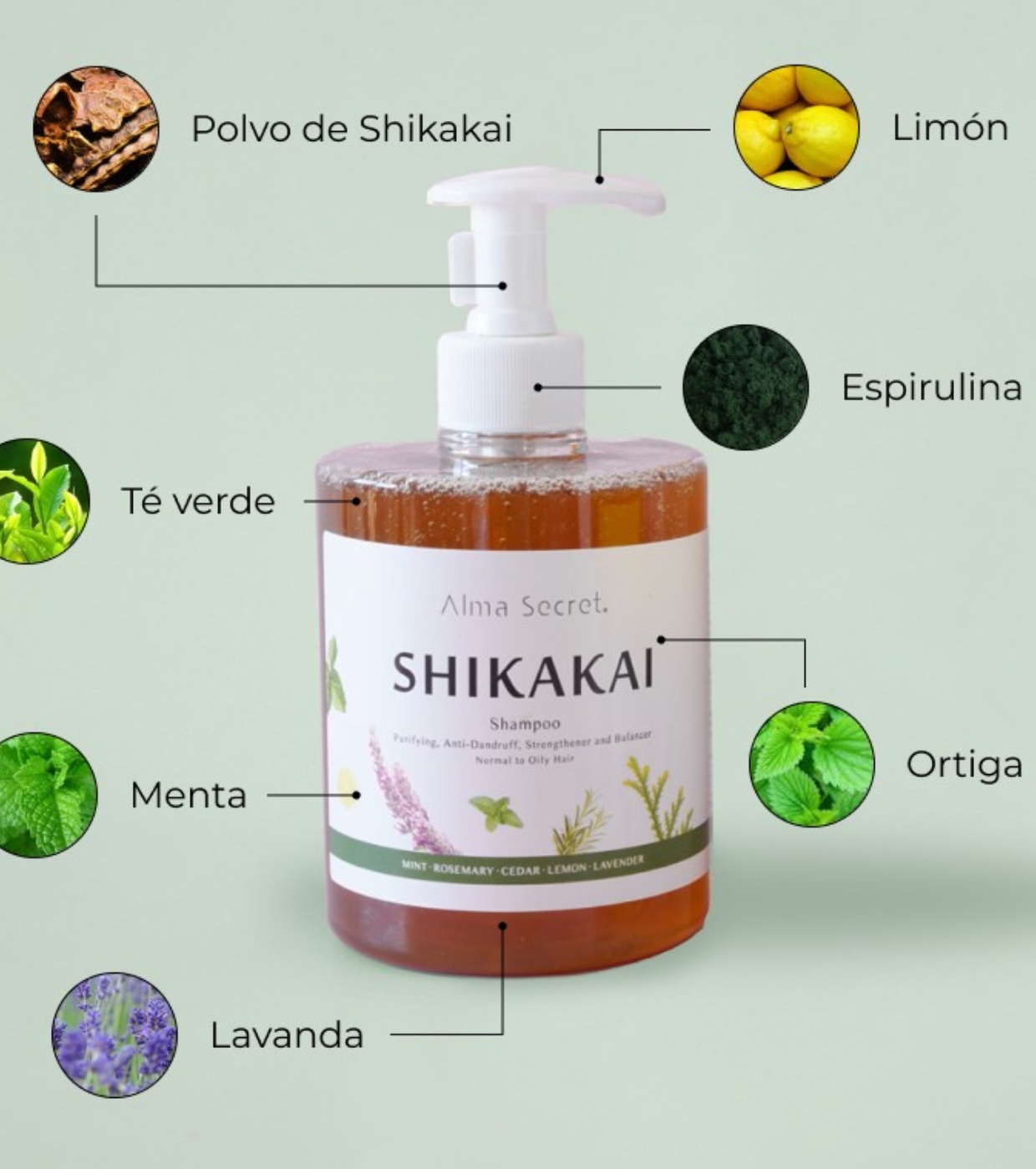 Aqua (Thermal Water), Lauryl Glucoside, Sodium Cocoamphoacetate, Glycerin, Sodium Cocoyl Glutamate, Sodium Lauryl Glucose Carboxylate, Decyl Glucoside, Hydrolyzed Keratin, Coco Glucoside, Glyceryl Oleate, Acacia Concinna Fruit Extract (Shikakai Extract), Cocos Nucifera Oil (Coconut Oil), Simmondsia Chinensis Seed Oil (Jojoba Oil), Betaine, Propanediol, Hydrolyzed Silk, Arthrospira Platensis Extract (Spirulina Extract), Lamium Album Extract, Artemisia Abrotanum Flower/Leaf/Stem Extract, Tropaeolum Majus Flower/Leaf/Stem Extract, Camellia Sinensis Leaf Extract, Aloe Barbadensis Leaf Juice, Panthenol (Provitamin B5),Mentha Piperita Oil,Romarinus Officinalis Flower Oil, Juniperus Virginiana Wood Oil, Citrus Limon Peel Oil, Lavandula Angustifolia Leaf Oil, Tocopherol, Xanthan Gum, Dehydroacetic Acid, Benzyl Alcohol, Potassium Sorbate, Ascorbyl Palmitate, Lactic Acid, Limonene, Linalool, Geraniol, Citral, Citronellol.* Tensioactivos naturales de origen vegetal. No contiene sulfatos.Natural surfactants of vegetable origin. Sulfate-Free.