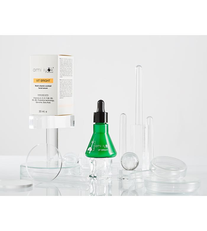 Un sérum avec un cocktail de vitamines hydrosolubles et liposolubles (VIT A, VIT C, VIT E, F, B2, B3, B5, B6) dans une émulsion inverse pour permettre de les associer en une seule formule de manière optimale concentrations et un PH totalement respectueux des peaux les plus sensibles.