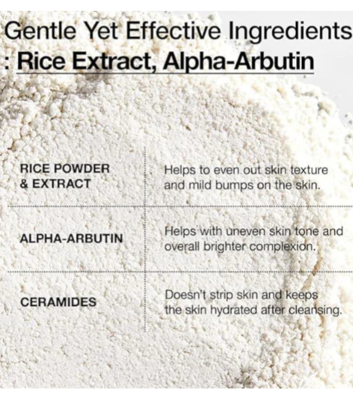 Zea Mays (Corn) Starch , Sodium Cocoyl Isethionate , Sodium Lauroyl Glutamate , Diglycerin, Allantoin, Maltodextrin, Papain, Kaolin (Ci 77004) , Zea Mays (Corn) Starch, Sodium Cocoyl Isethionate, Sodium Lauroyl Glutamate, Diglycerin, Allantoin, Maltodextrin, Papain, Sodium Bicarbonate, Citric Acid, Sodium Polyacrylate, Water, Oryza Sativa (Rice) Powder, Oryza Sativa (Rice) Lees Extract , Oryza Sativa (Rice) Bran Water , 1,2-Hexanediol, Oryza Sativa (Rice) Extract, Water, Butylene Glycol, 1,2-Hexanediol , Dipropylene Glycol, Oryza Sativa (Rice) Extract, Hydrolyzed Rice Protein, Oryza Sativa (Rice) Seed Protein, Ceramide NP, Ceramide NP, Ascorbic Acid, Alpha-Arbutin, Protease, Butylene Glycol, 1,2-Hexanediol, Caprylyl Glycol , Glucose, Papain , Glycerin, Water, Citric Acid, Tartaric Acid, Lactic Acid.