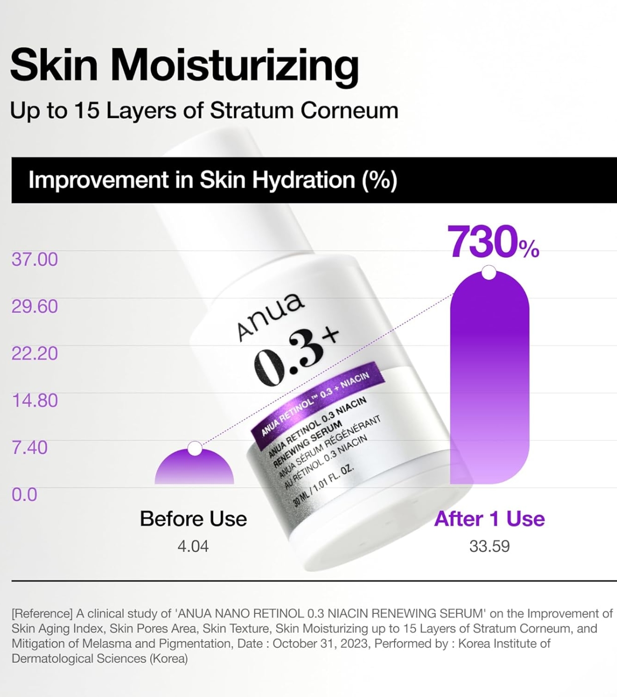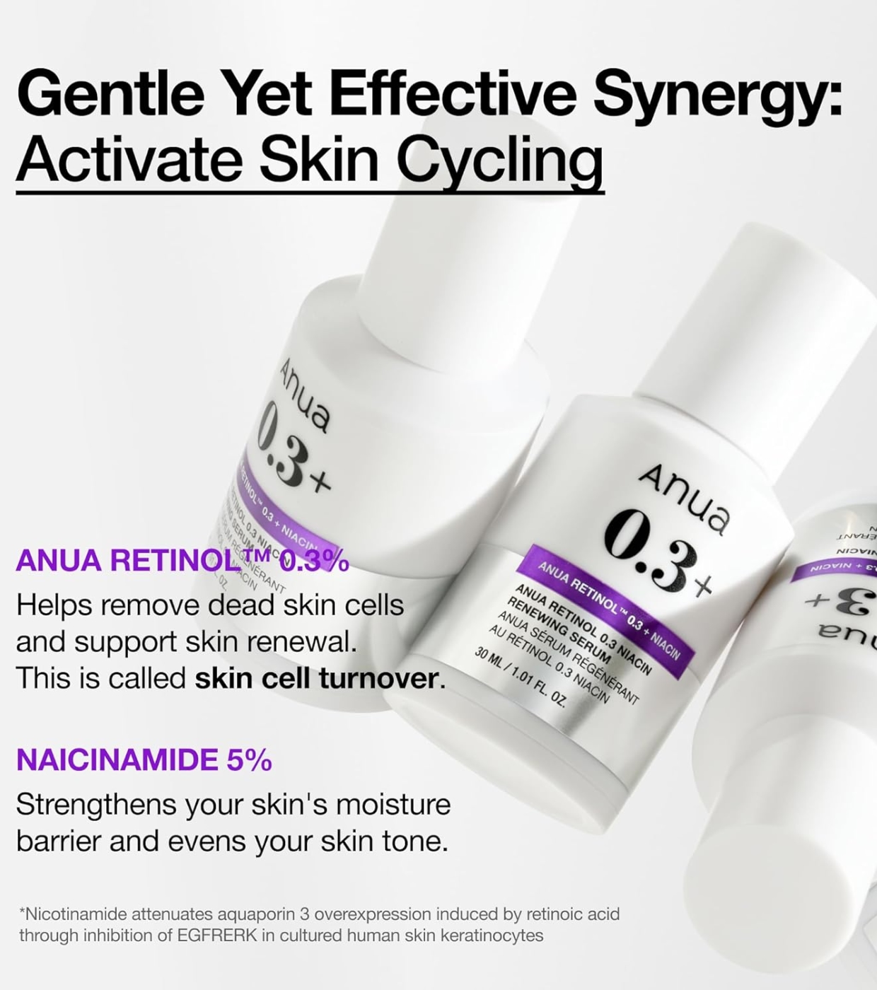 Le sérum de nuit régénérant à 0,3 % de rétinol et de niacinamide d' Anua est idéal pour ceux qui cherchent à traiter les signes du vieillissement, l'hyperpigmentation et la texture inégale de la peau sans provoquer d'irritation.