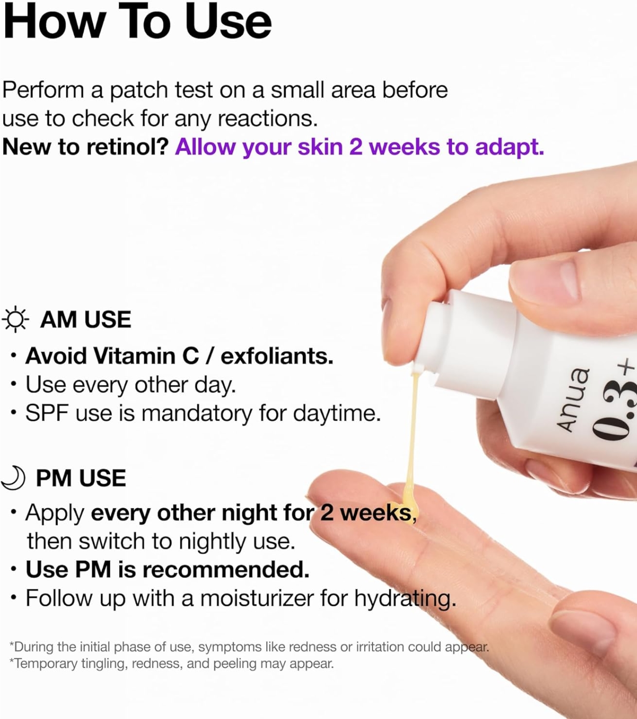 Recommandation : Appliquer le soir sur une peau propre et sèche. Utiliser une crème solaire pendant la journée. Introduire progressivement le rétinol si vous n'en avez jamais utilisé auparavant.