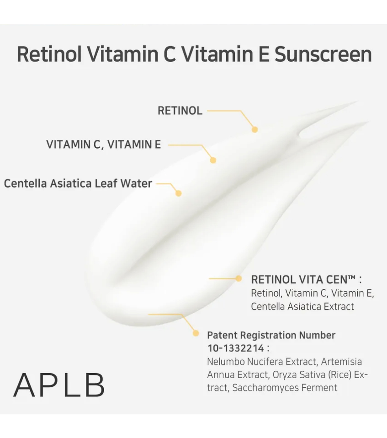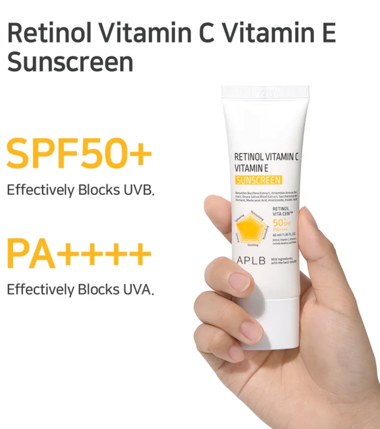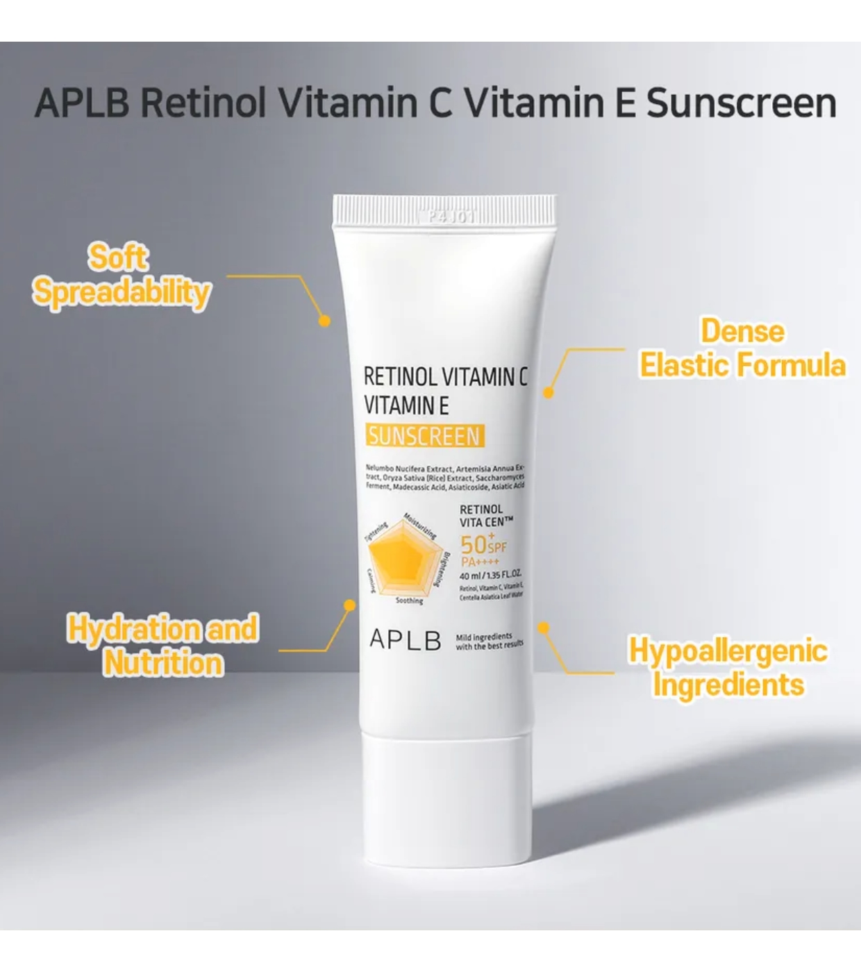 Le Retinol Vitamin C Vitamin E Sunscreen SPF50+ PA++++ de APLB est bien plus qu'une simple crème solaire : c'est un traitement anti-âge complet qui combine une haute protection solaire avec des ingrédients antioxydants et régénérants pour une peau plus jeune, plus éclatante et plus saine.