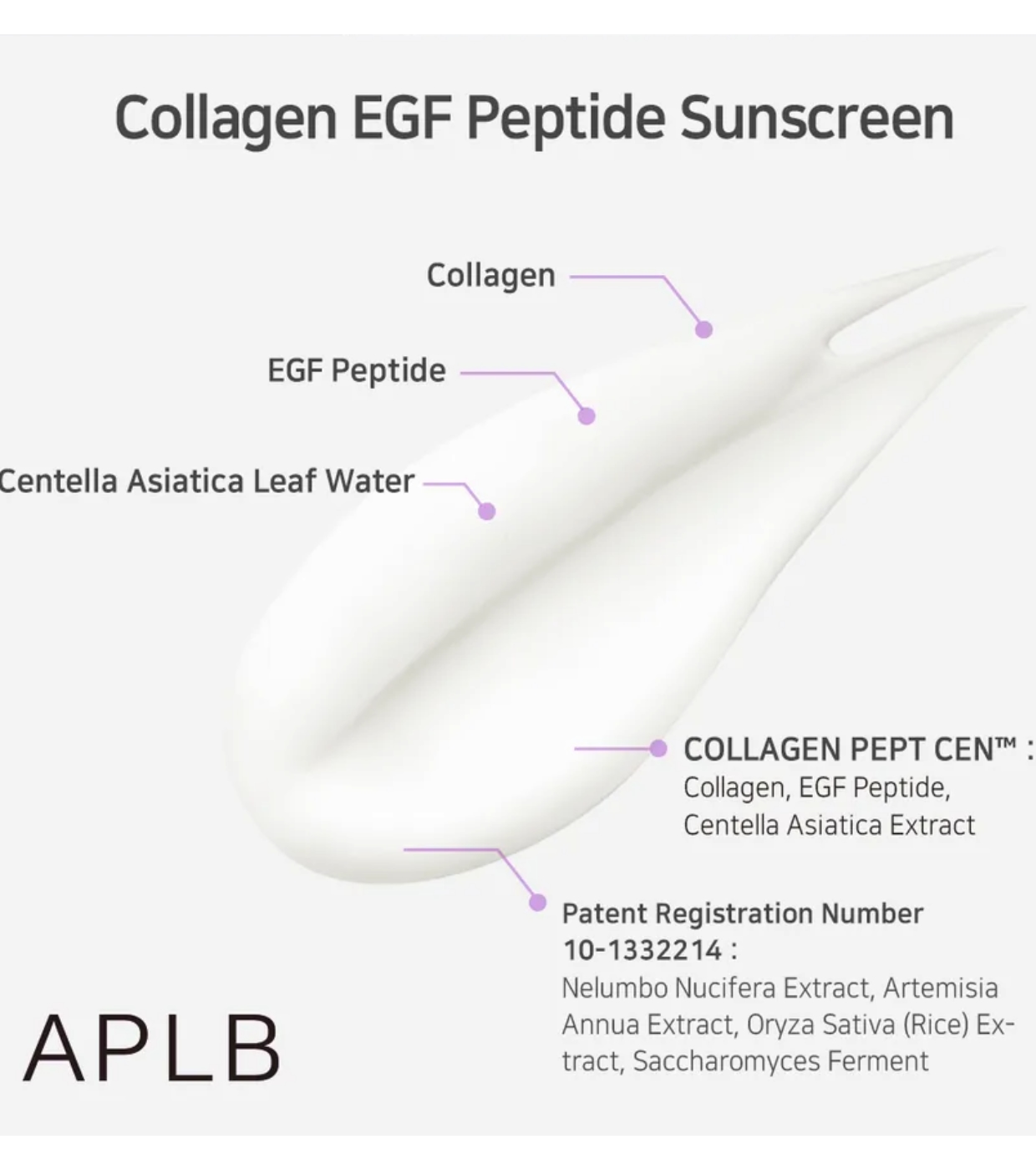 Collagen EGF Peptide Sunscreen Collagen EGF Peptide Sunscreen est un écran solaire multifonctionnel qui offre une haute protection SPF50+ PA++++ contre les rayons UVA et UVB, tout en hydratant, raffermissant et protégeant la peau du vieillissement prématuré.