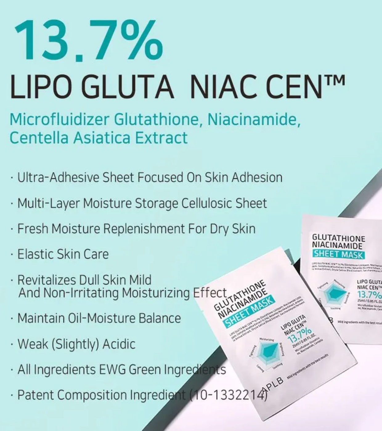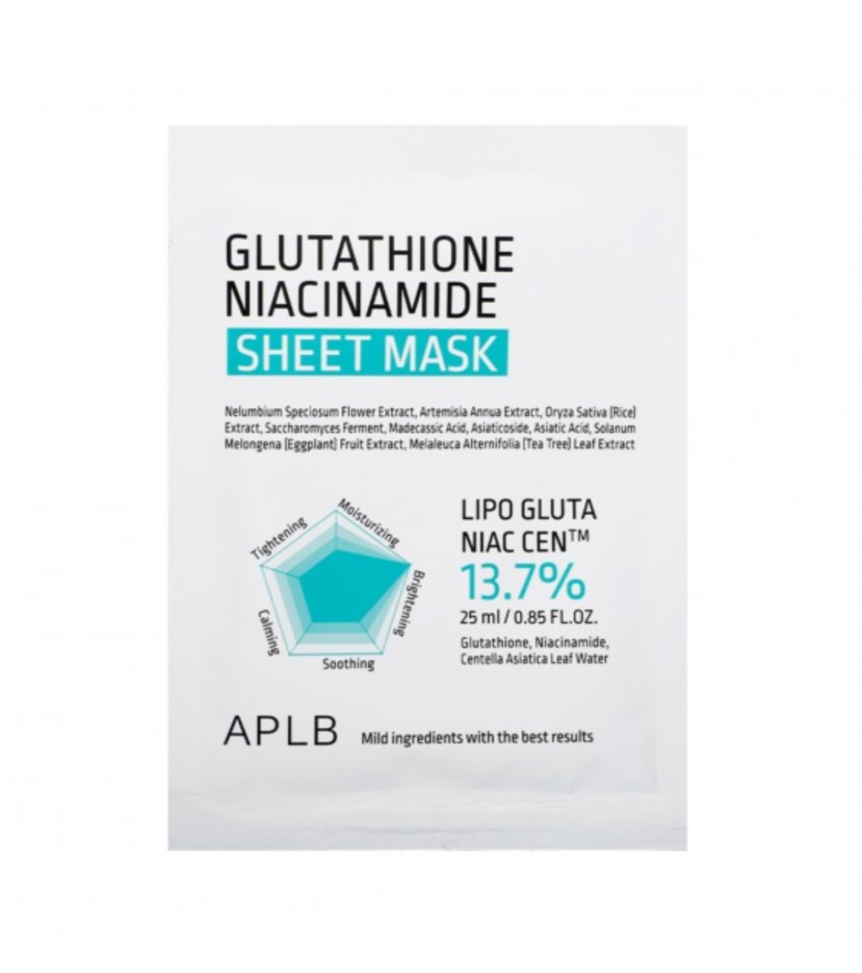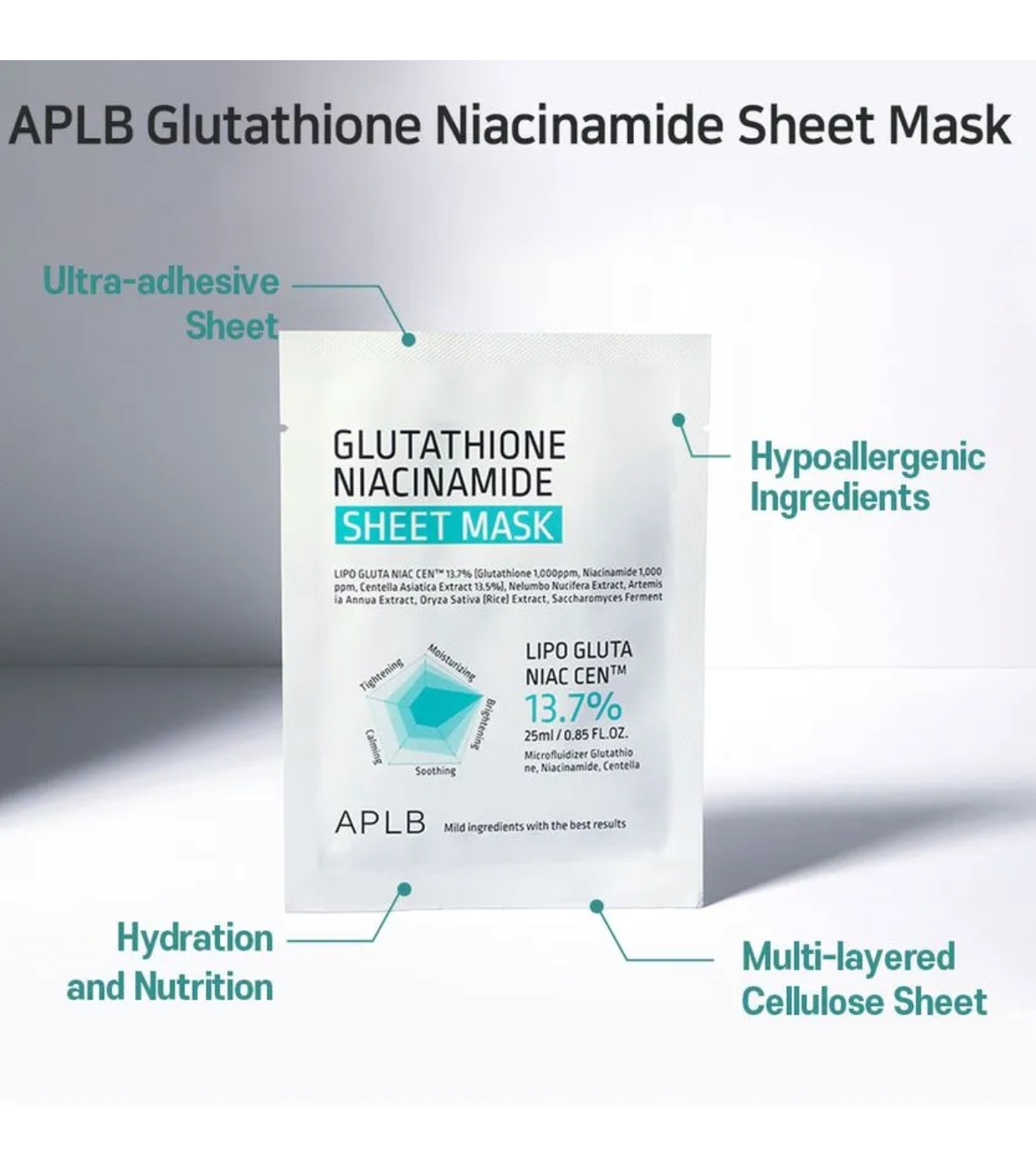 Le Glutathione Niacinamide Sheet Mask d'APLB est un masque facial en tissu ultra-fin conçu pour hydrater, apaiser et éclaircir la peau fatiguée, terne ou sensible.