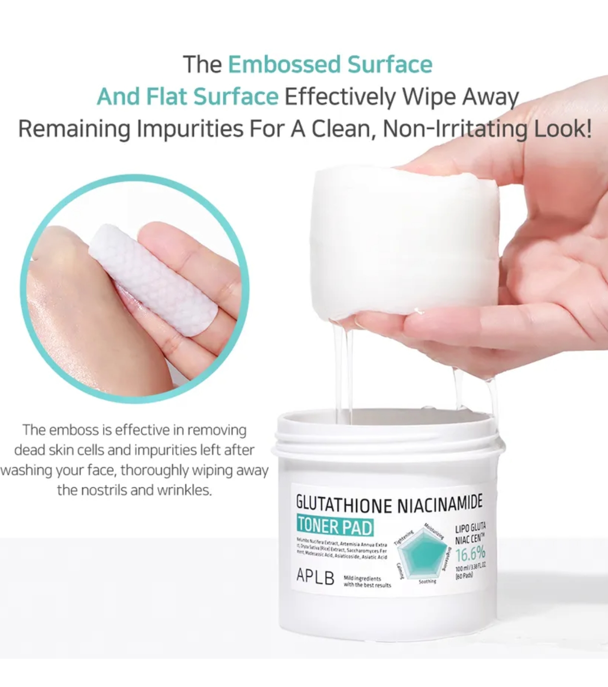 Glutathione Niacinamide Toner Pads Les tampons toniques au glutathion niacinamide sont des cotons imbibés d'un tonique léger qui hydratent, apaisent et donnent de l'éclat à la peau rapidement et efficacement.
