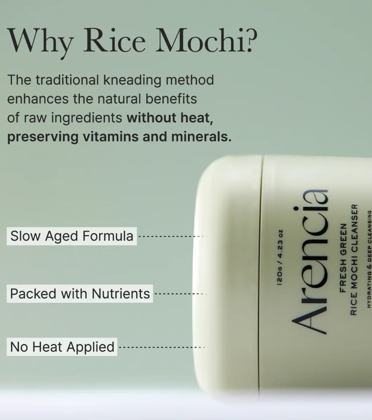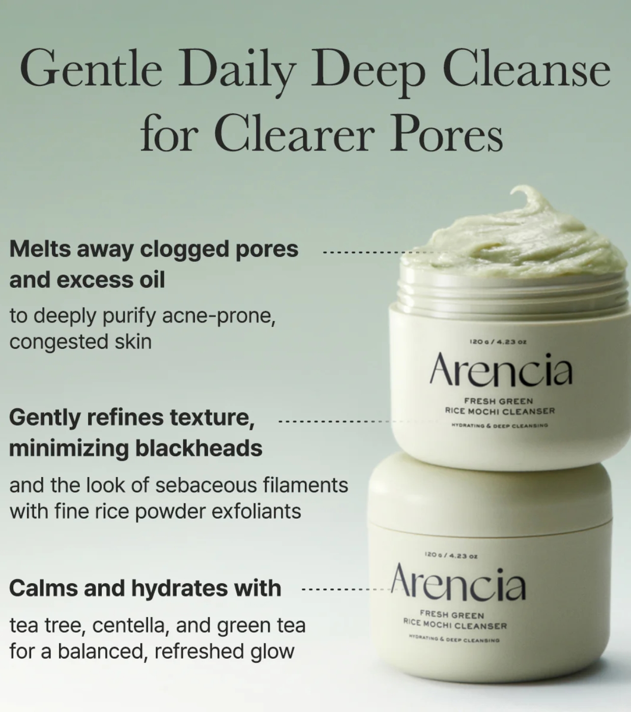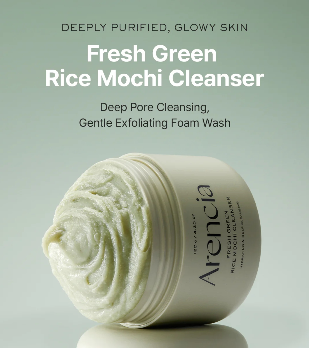 Le nettoyant Fresh Green Rice Mochi de Arencia est une mousse nettoyante purifiante formulée pour les peaux grasses, congestionnées ou sujettes à l'acné.