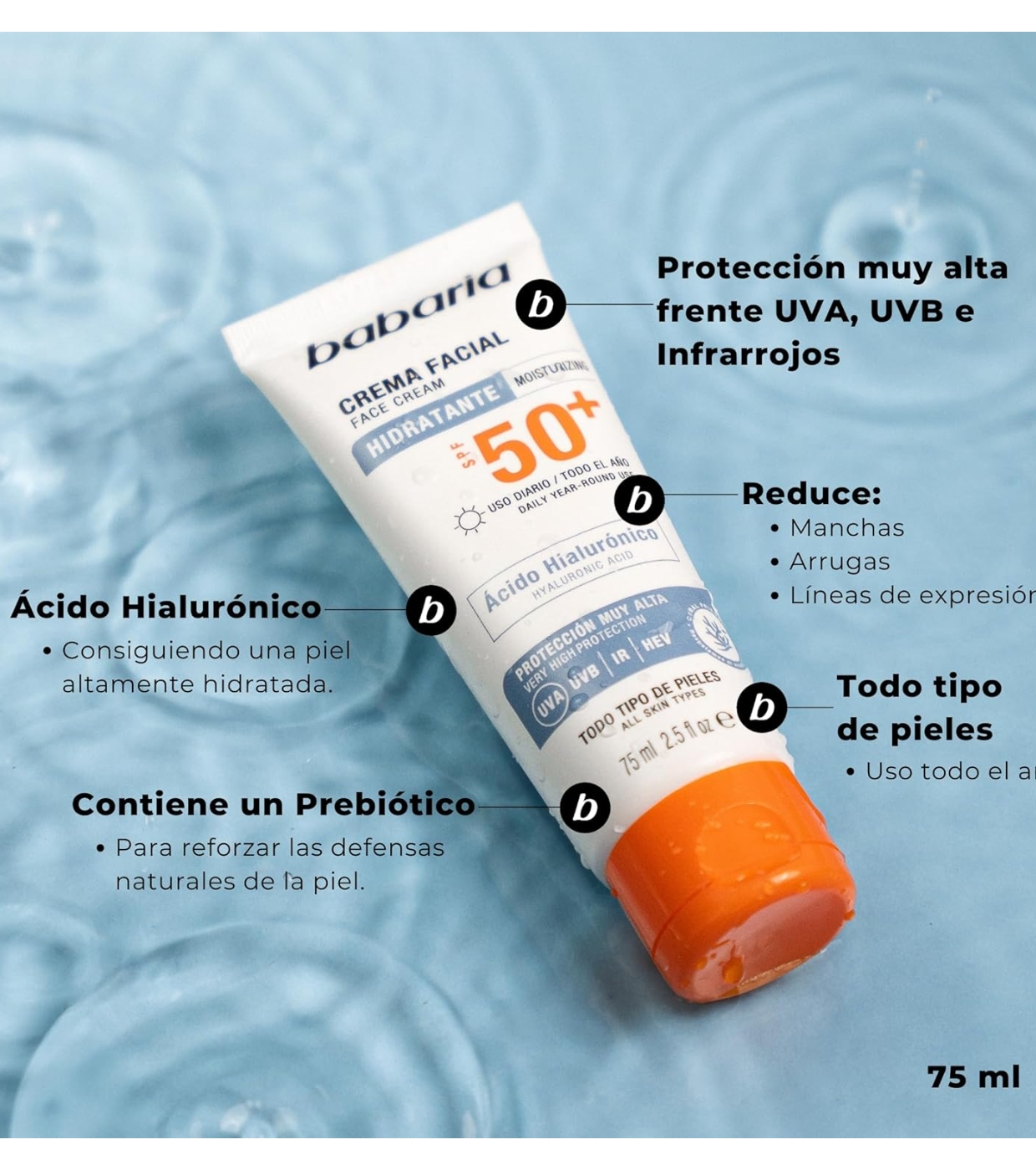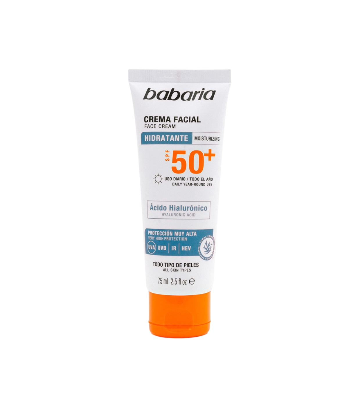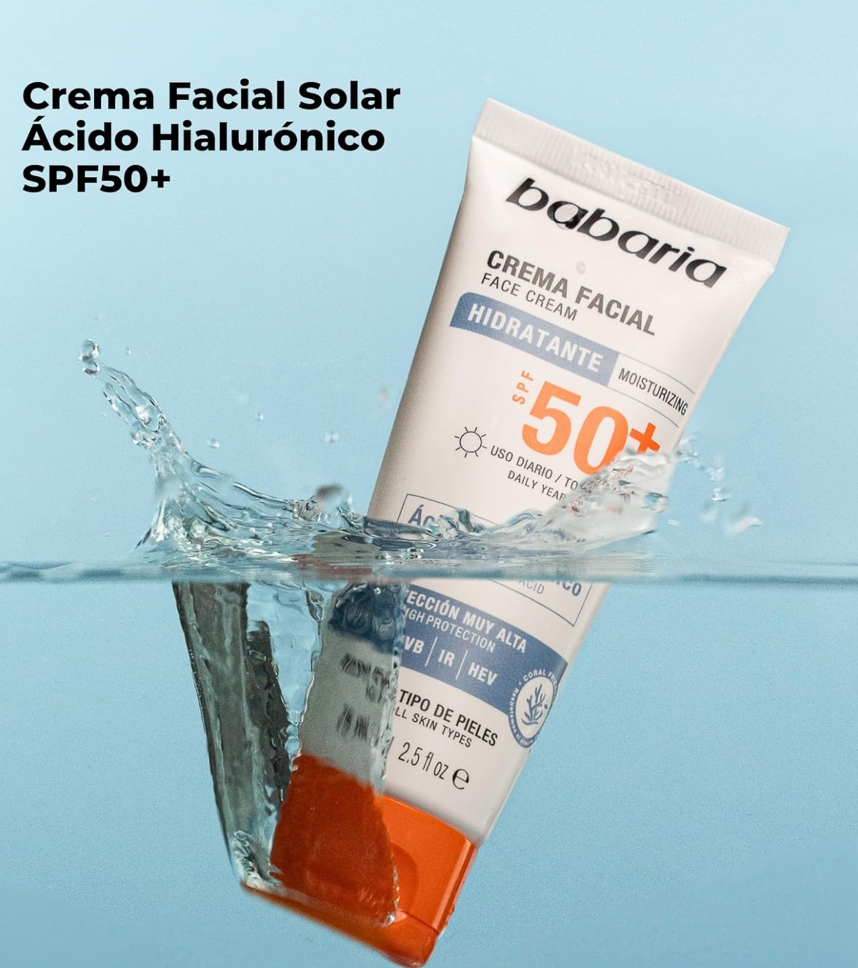 Babaria La Crème Solaire Hydratante Visage SPF50+ à l'Acide Hyaluronique offre une solution de soin complète : protection intégrale à 360°, hydratation intense et action anti-âge, dans une formule légère et efficace pour une utilisation quotidienne toute l'année.