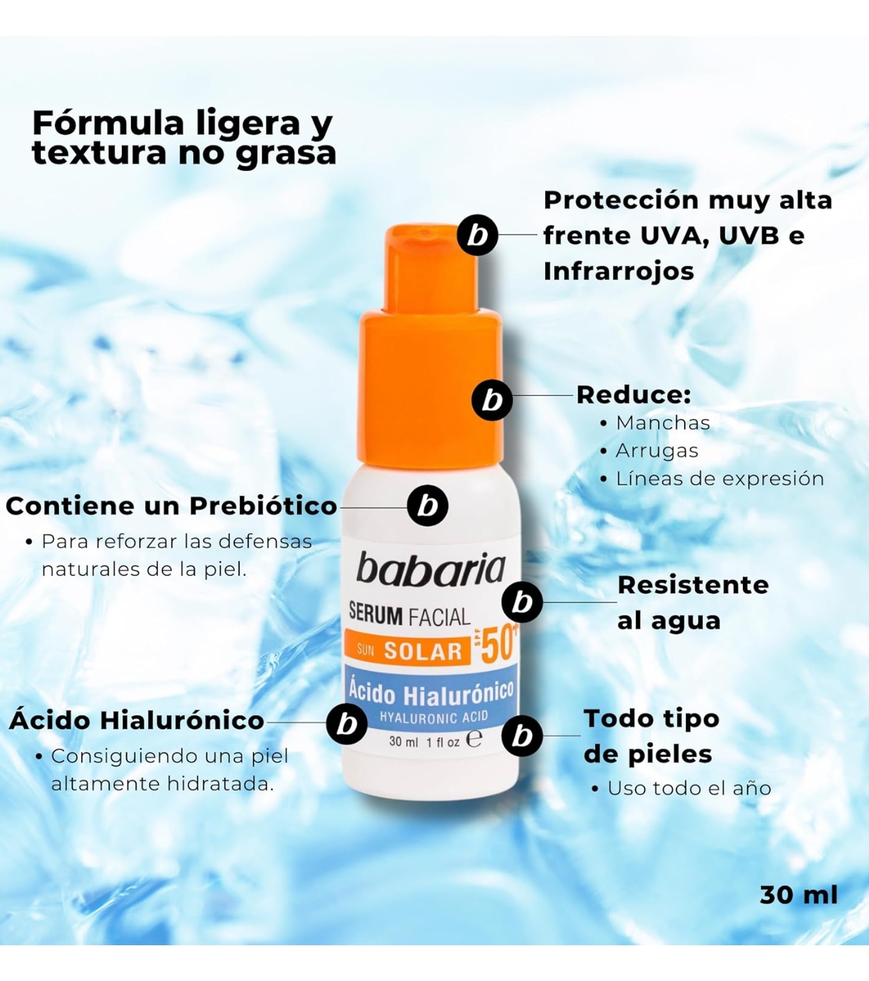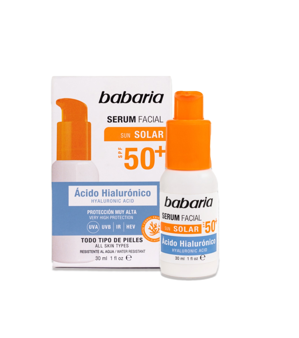 Babaria Le sérum visage illuminateur à l'acide hyaluronique SPF 50+ combine traitement et protection en un seul geste.