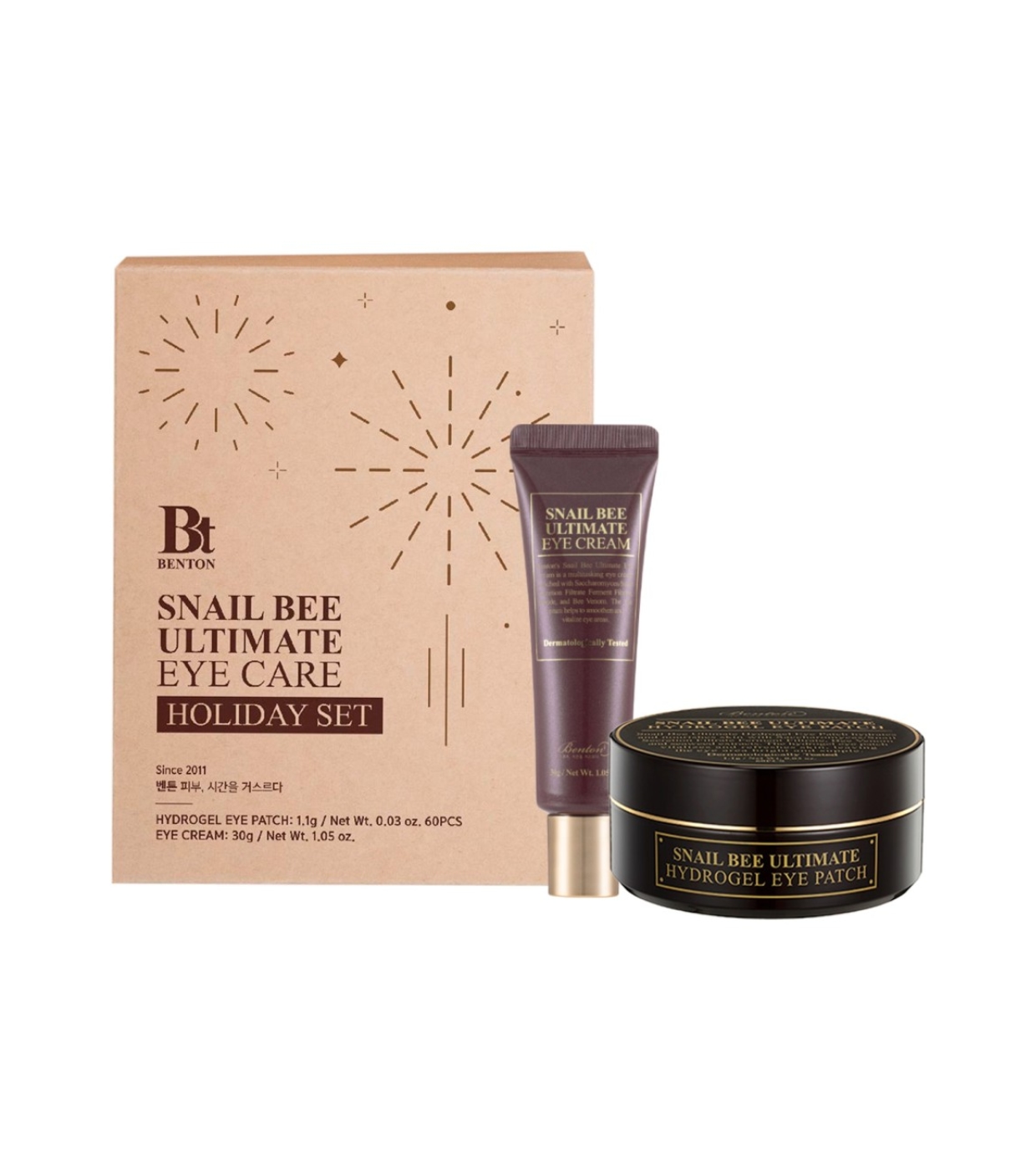 Découvrez le pouvoir régénérant de la ligne Snail Bee Ultimate avec le kit contour des yeux Holiday Set et les patchs hydrogel de Benton .