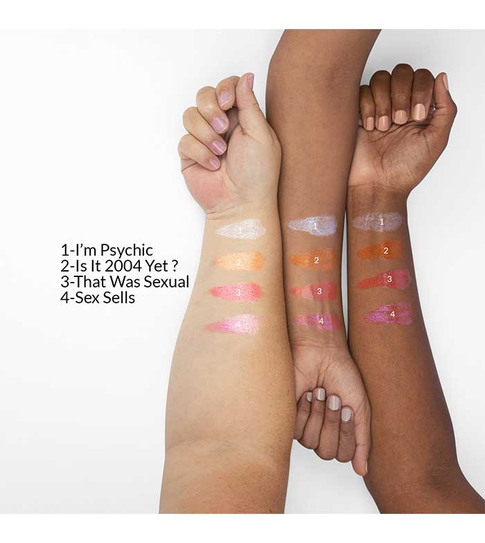 Polybutene, Caprylic/Capric Triglyceride, Diisostearyl Malate, Silica Silylate, Synthetic Fluorphlogopite (Only in That Was Sexual, I'm Psychic, & Is It 2004 Yet?), Calcium Titanium Borosilicate (Only in I'm Psychic), Phenoxyethanol, Caprylyl Glycol, Mica (Only in Sex Sells, & Is It 2004 Yet?), Tocopheryl Acetate, Calcium Aluminum Borosilicate (Only in Sex Sells), Tin Oxide (Only in I'm Psychic, Sex Sells, & Is It 2004 Yet?), Silica (Only in Sex Sells), Alumina (Only in That Was Sexual), Glycerin (Only in That Was Sexual). May Contain/Peut Contenir [+/-: Titanium Dioxide (CI 77891), Iron Oxides (CI 77491, CI 77492, CI 77499), D&C Red 28 Lake (CI 45410), D&C Red 30 Lake (CI 73360)].