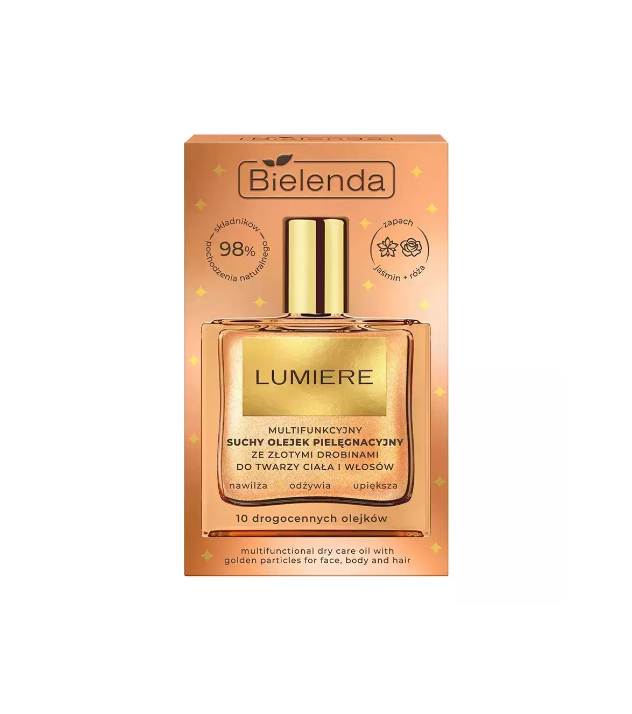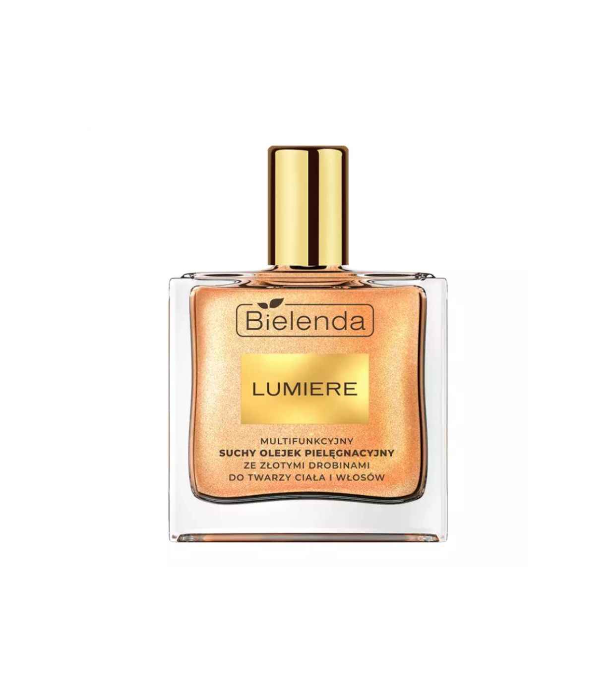 L' Huile Sèche Multifonctionnelle Lumiere Shimmer de Bielenda est un soin de luxe conçu pour prendre soin du visage, du corps et des cheveux en une seule application.