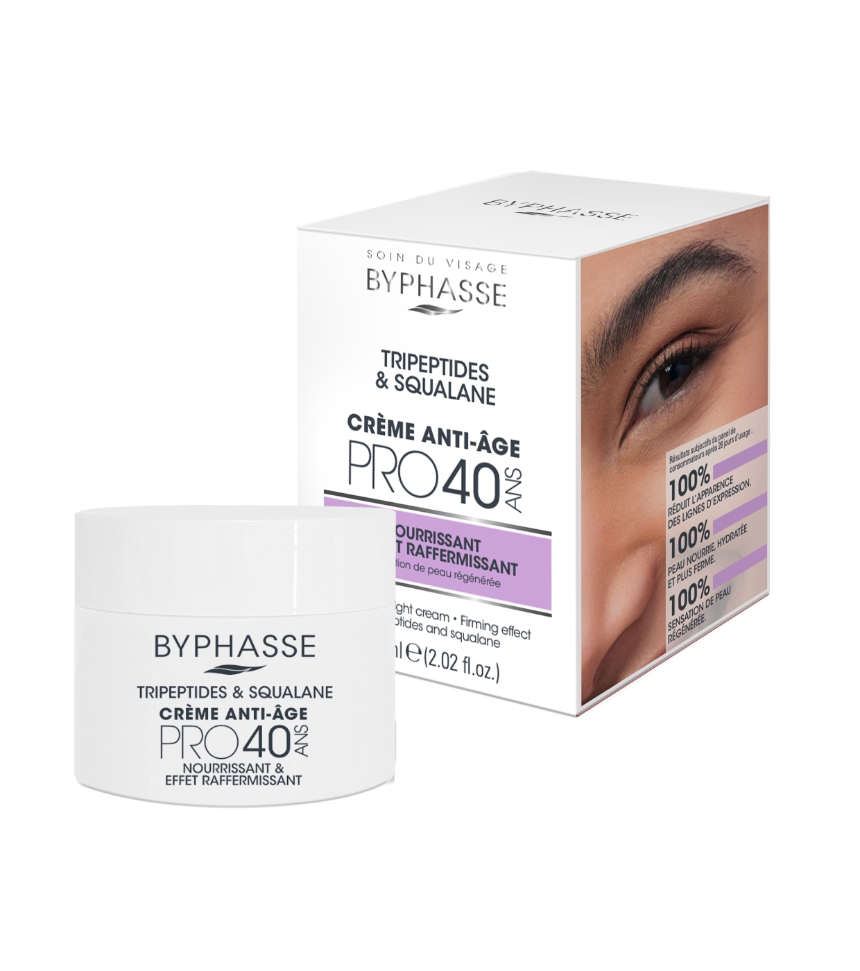 Crème visage anti-âge Byphasse à la formule innovante qui associe les principes actifs de la perle et les substances nutritives du caviar pour la régénération et la fermeté de votre peau.
