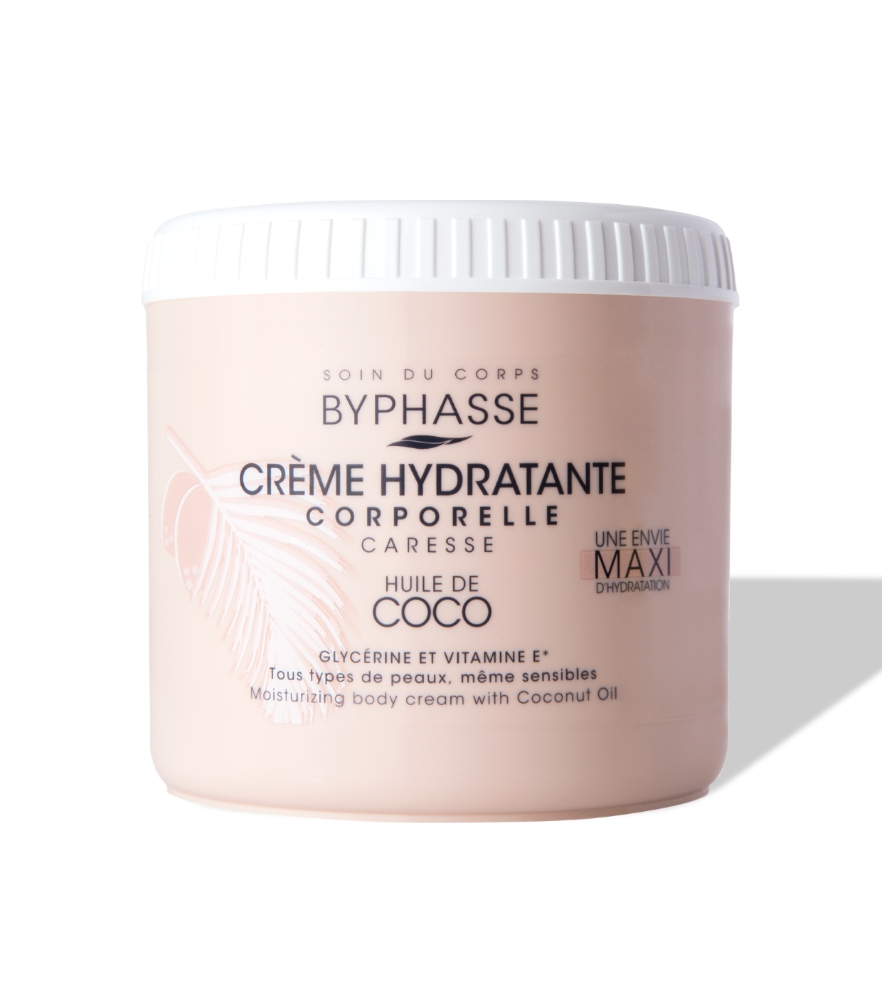 La crème hydratante pour le corps à l'huile de coco au format 500 ml, formulée à base de glycérine, de beurre de karité et enrichie en vitamine E, hydrate la peau.