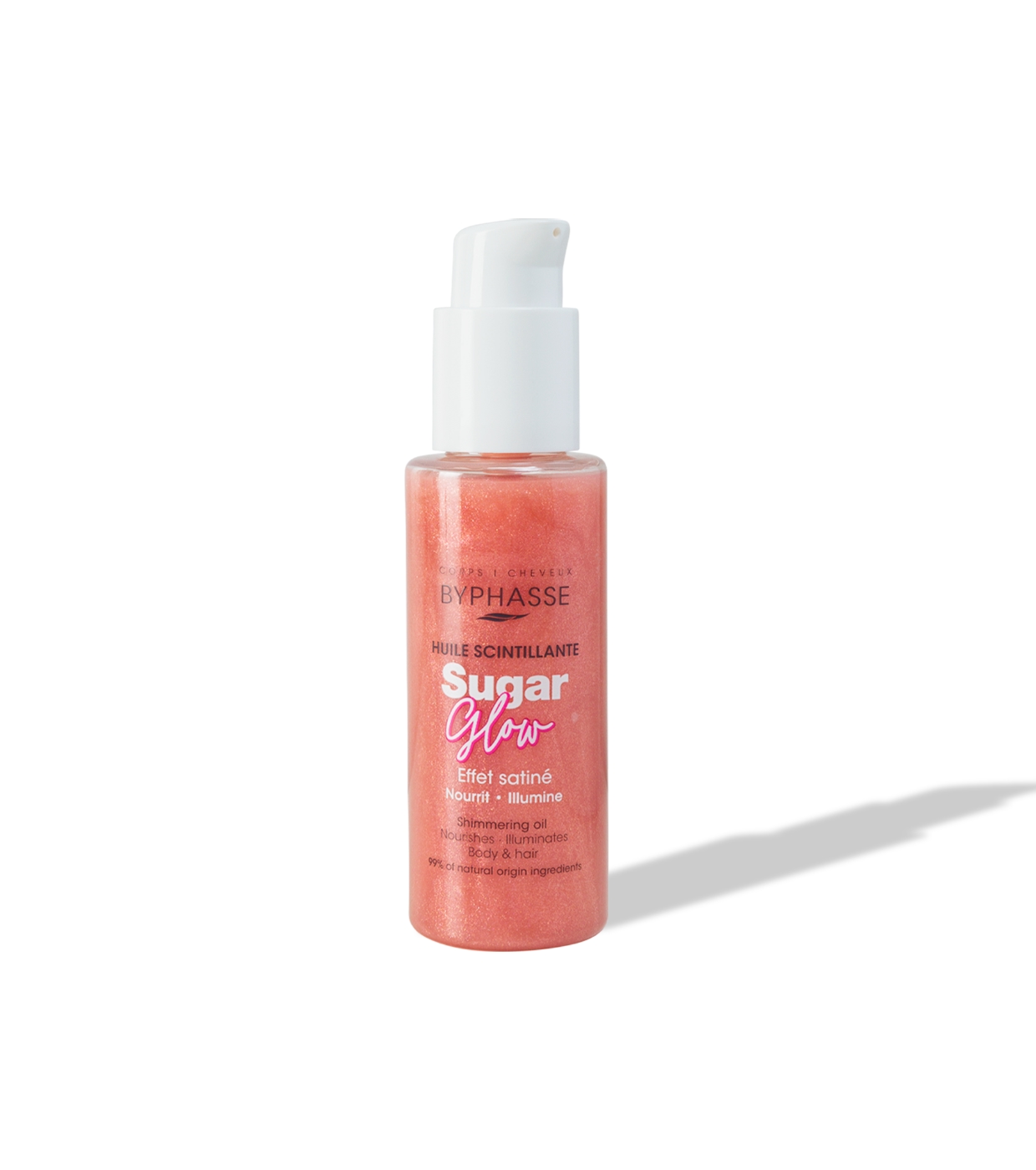 L'huile brillante Sugar Glow de Byphasse nourrit la peau et les cheveux, les laissant lumineux, doux et sublimes avec un fini éclatant et délicat.