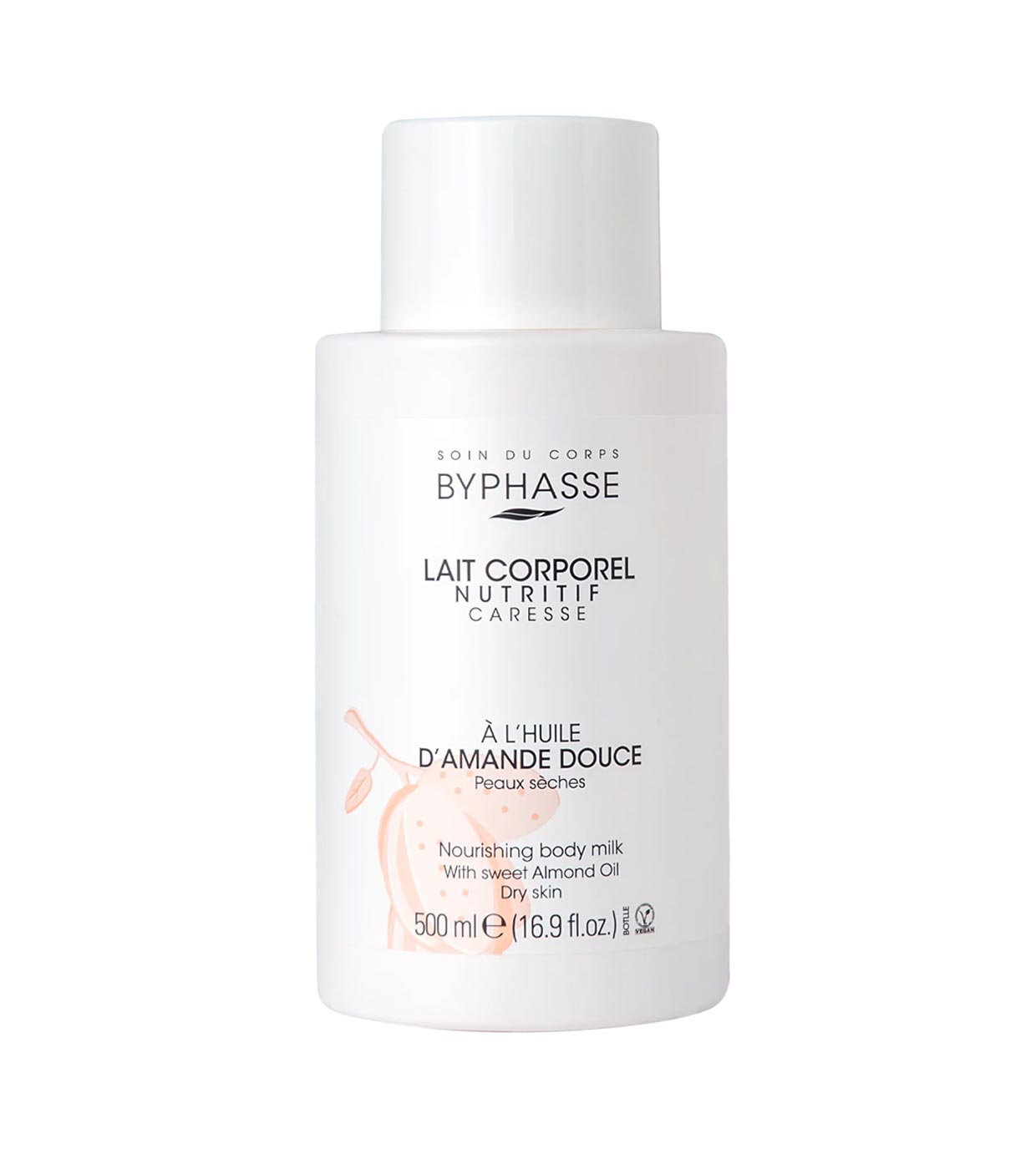 Lait corporel nutritif à l'huile d'amande douce, idéal pour les peaux sèches.