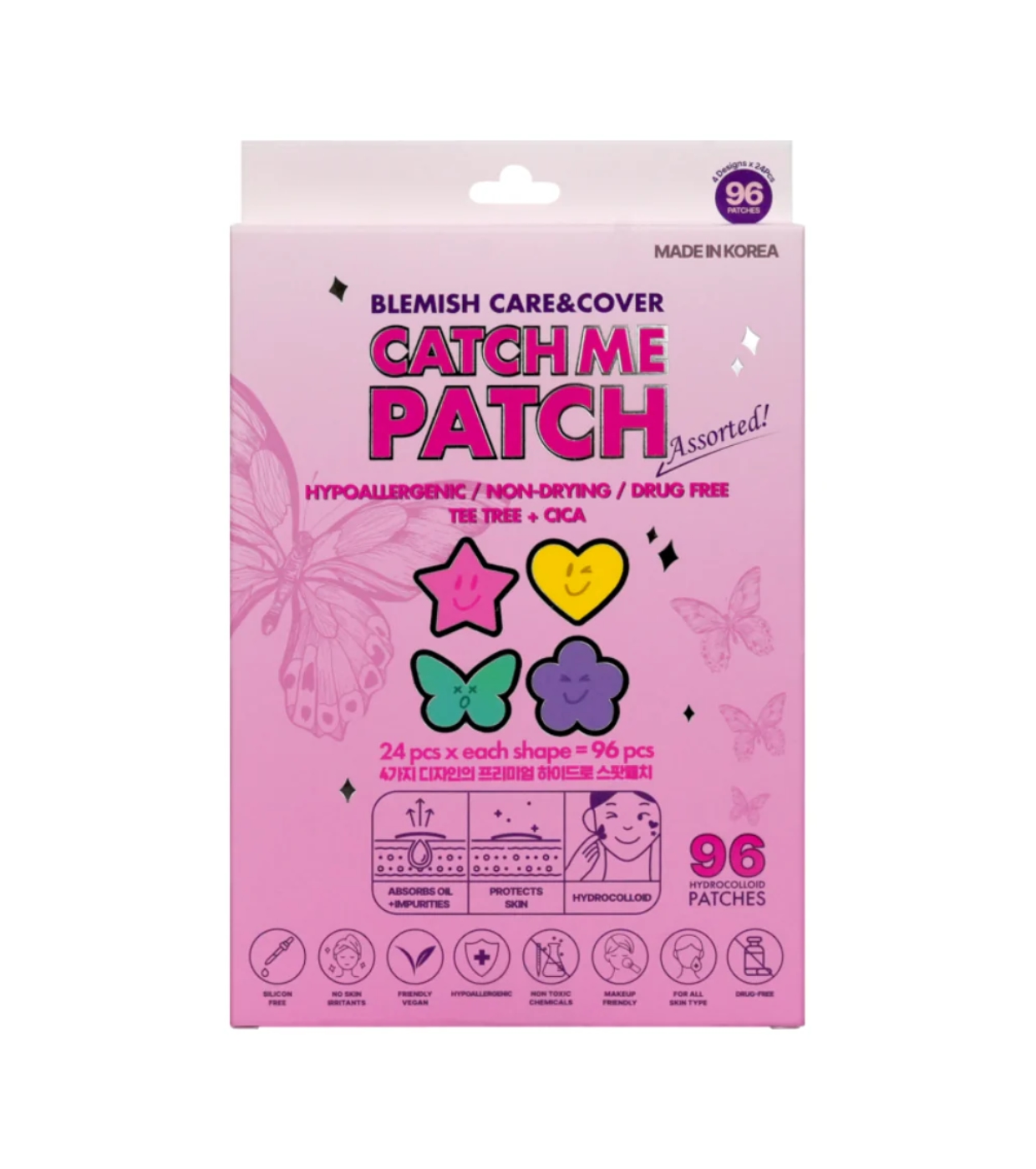 Ce kit comprend 96 patchs de quatre formes différentes qui absorbent l'excès de sébum et les impuretés, favorisant une guérison plus rapide des imperfections.