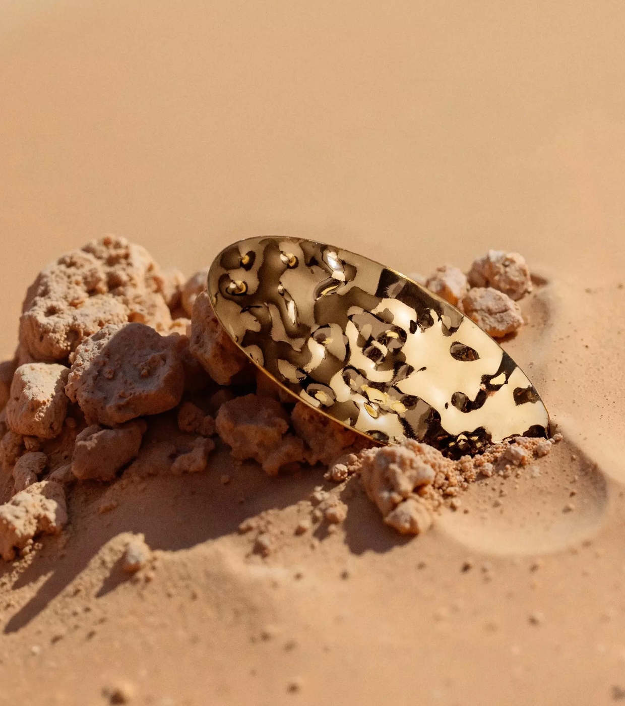Inspirée par la majesté des paysages dorés et l'élégance d'une esthétique futuriste, cette pince à cheveux Catrice présente une finition dorée martelée qui capture la lumière comme les dunes au coucher du soleil.