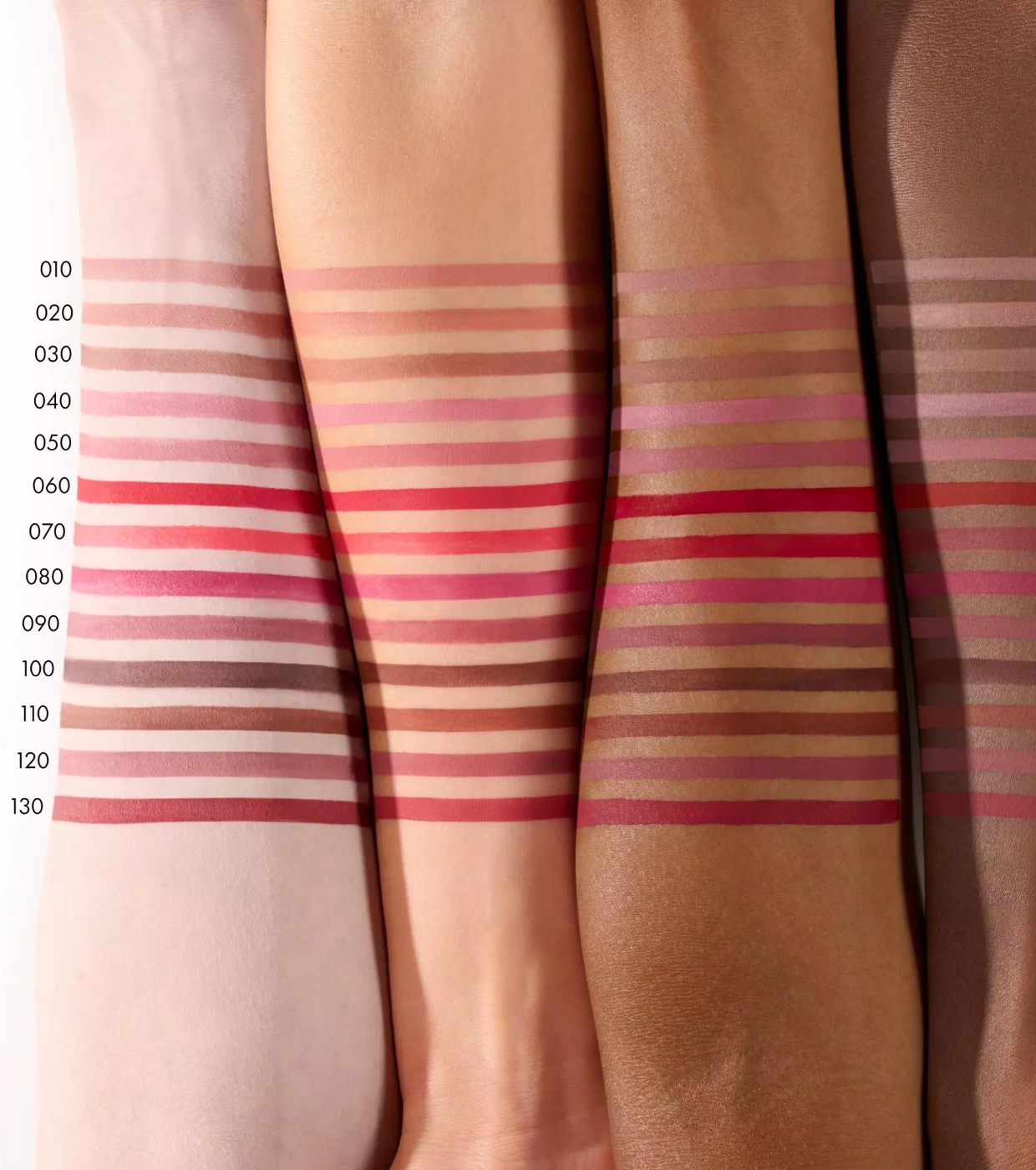 Sa formule légère et longue tenue glisse en douceur sur les lèvres pour un fini mat velouté qui ne se transfère pas et ne sèche pas.