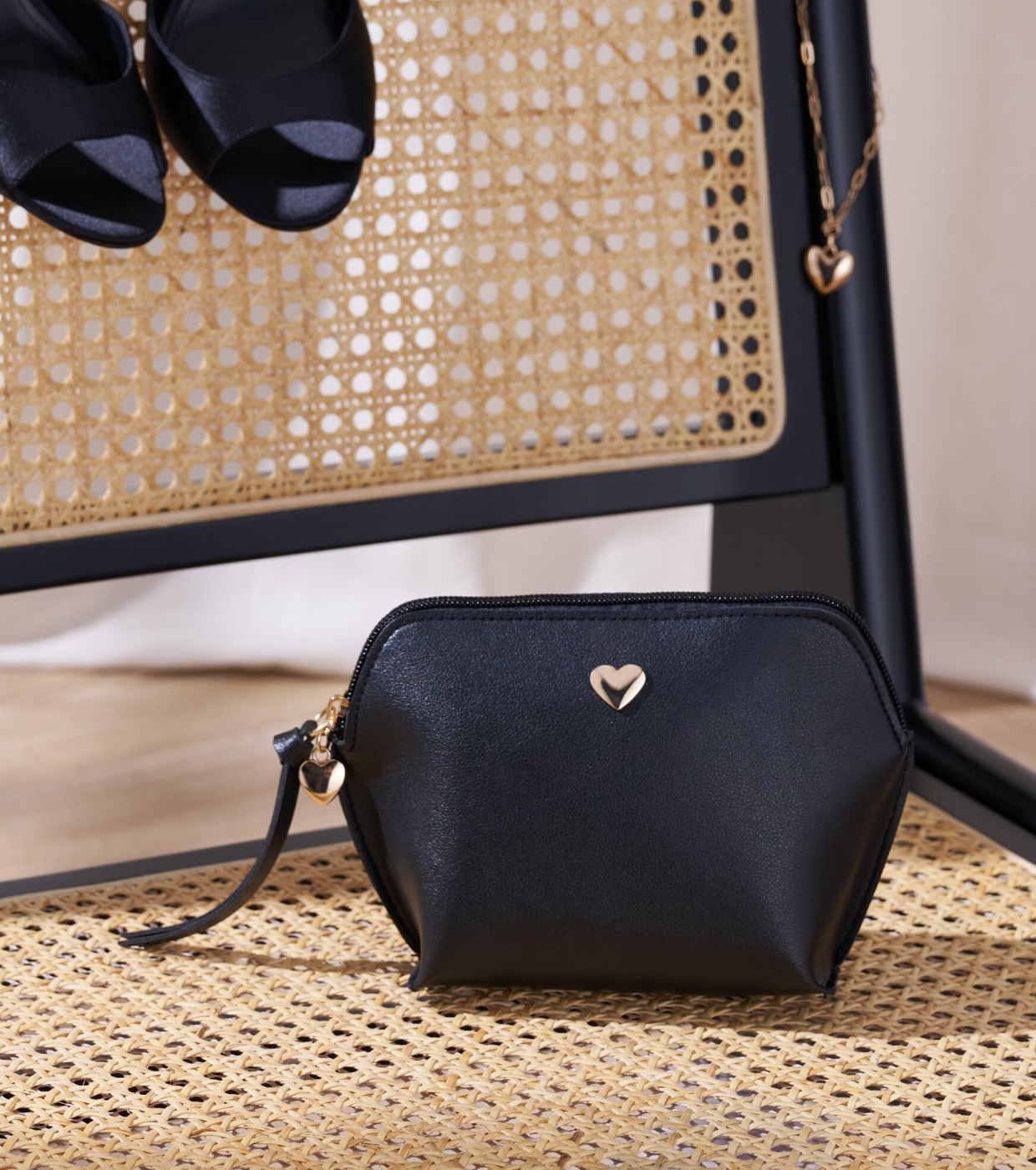 Sa finition effet cuir noir est associée à des détails dorés, tels que le délicat cœur métallique sur le devant et la poignée en forme de cœur, ajoutant une touche romantique et sophistiquée.