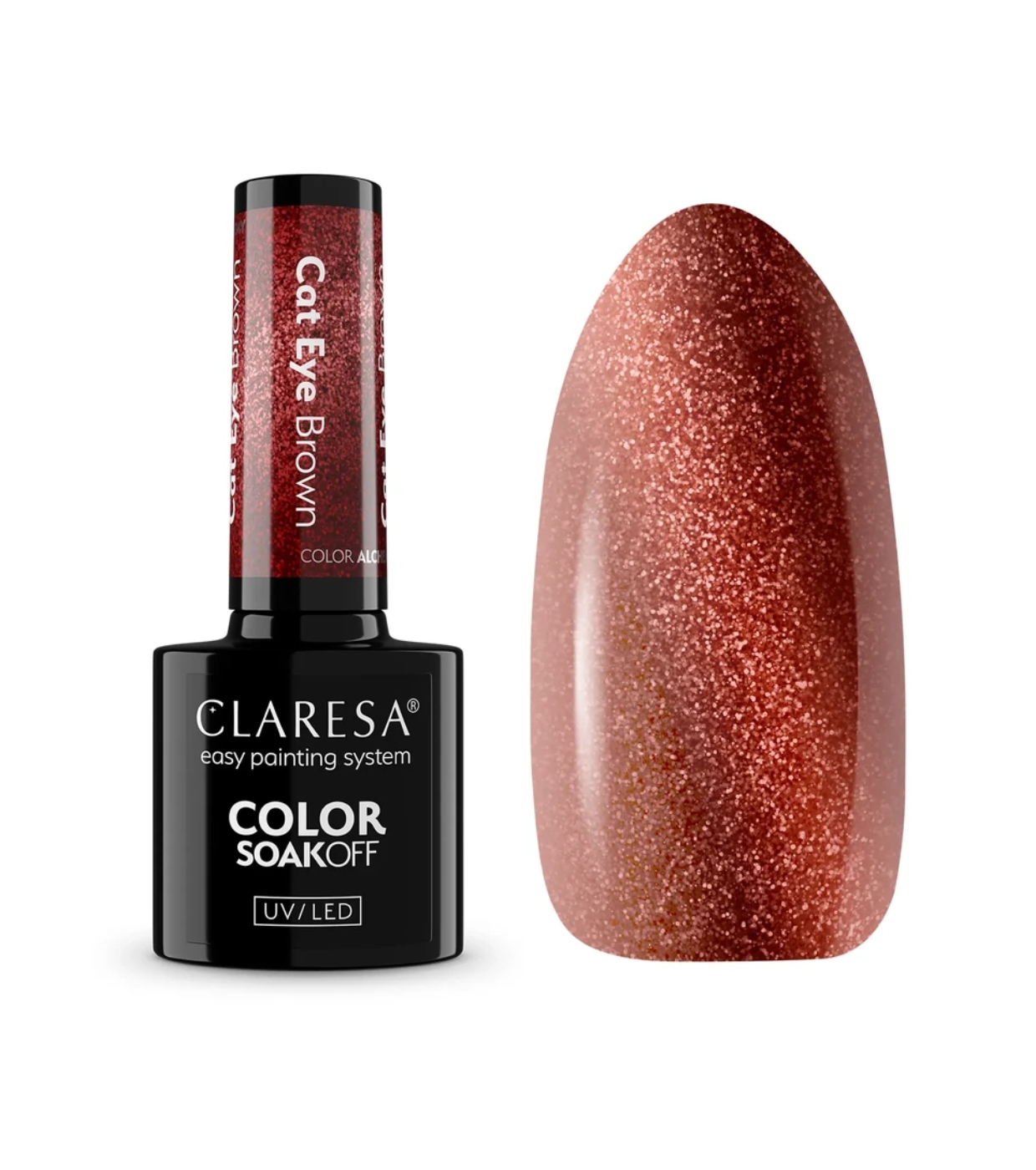 Le vernis à ongles semi-permanent Claresa avec une finition « œil de chat » crée le fameux effet œil de chat lorsqu'un aimant est approché, générant un reflet lumineux semblable à une pierre précieuse qui change avec le mouvement de la main et est spectaculaire sous n'importe quelle lumière.