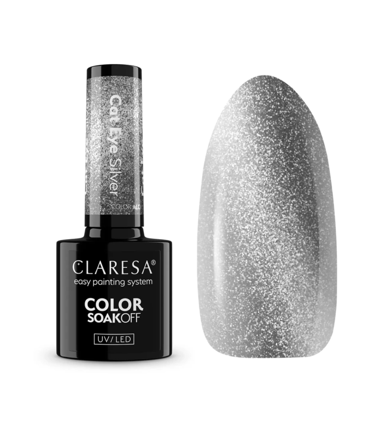 Le vernis à ongles semi-permanent Claresa avec une finition « œil de chat » crée le fameux effet œil de chat lorsqu'un aimant est approché, générant un reflet lumineux semblable à une pierre précieuse qui change avec le mouvement de la main et est spectaculaire sous n'importe quelle lumière.