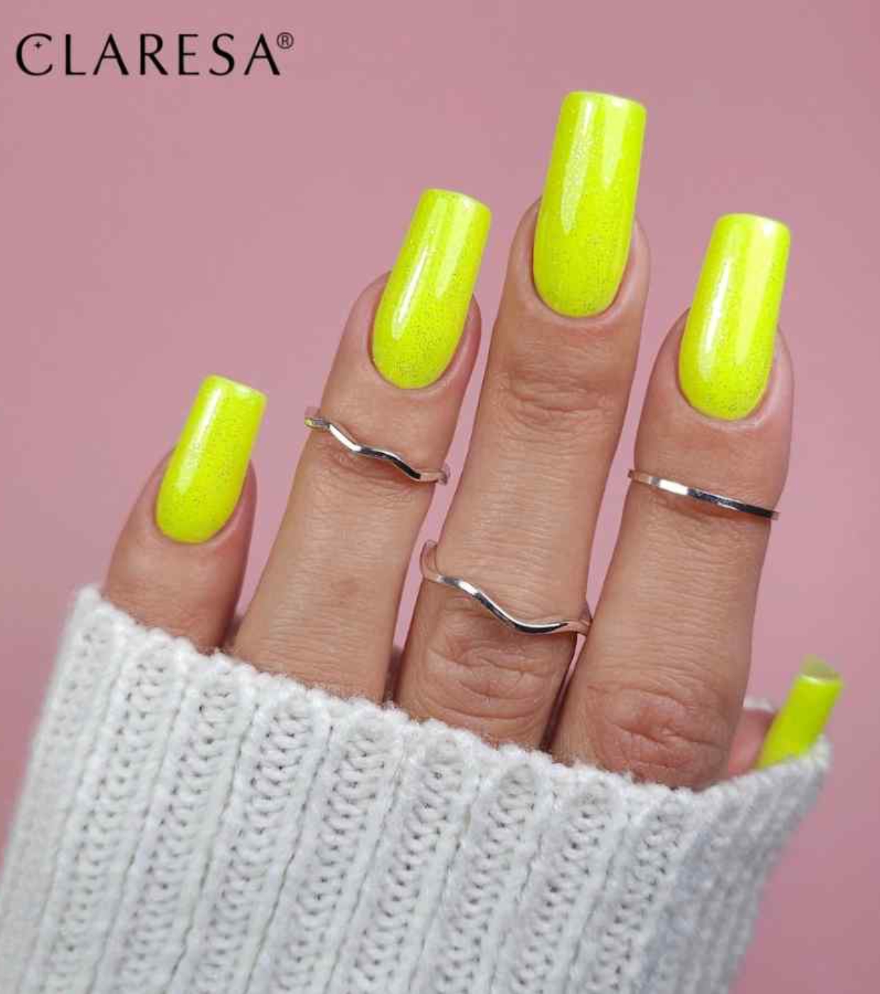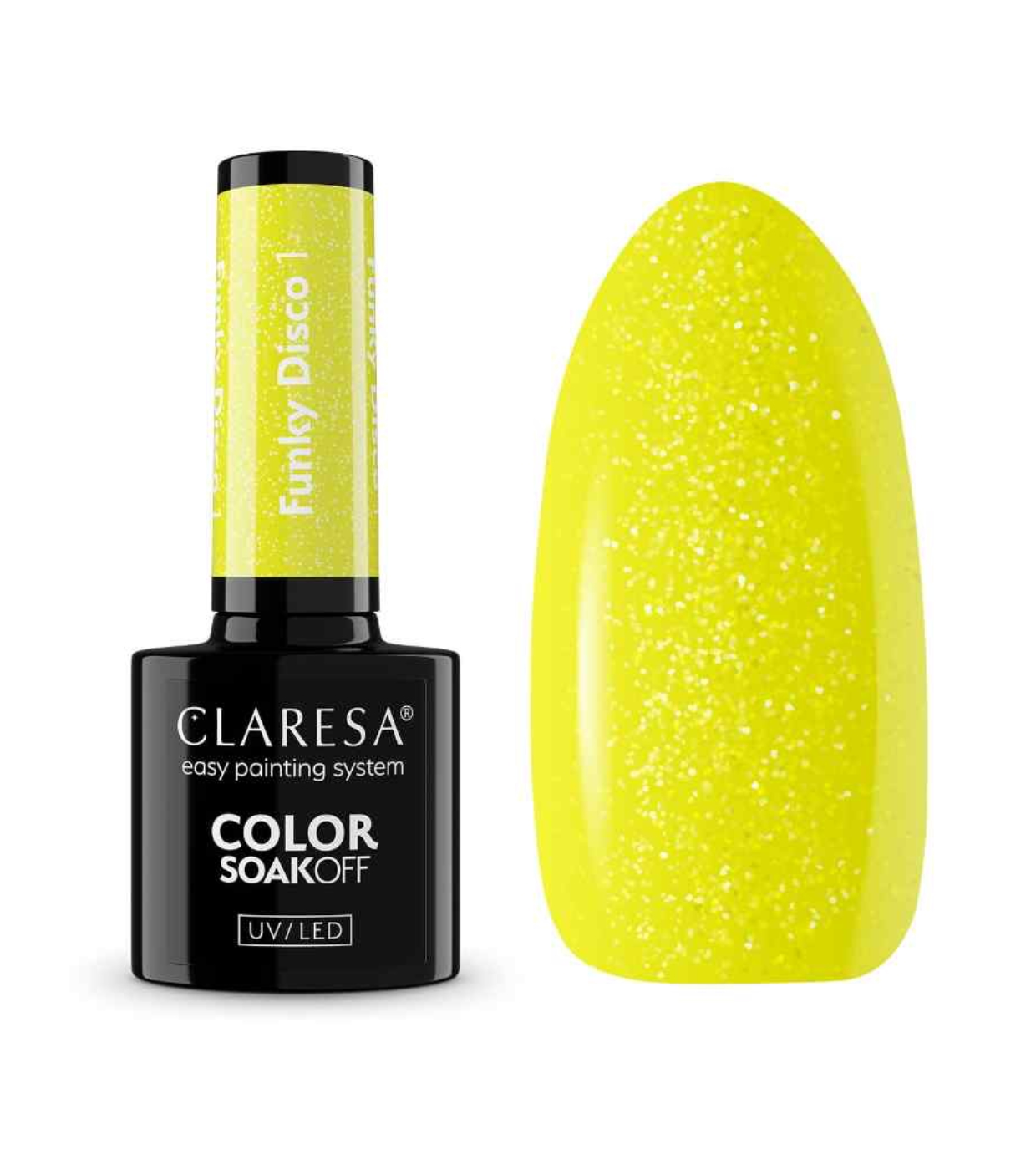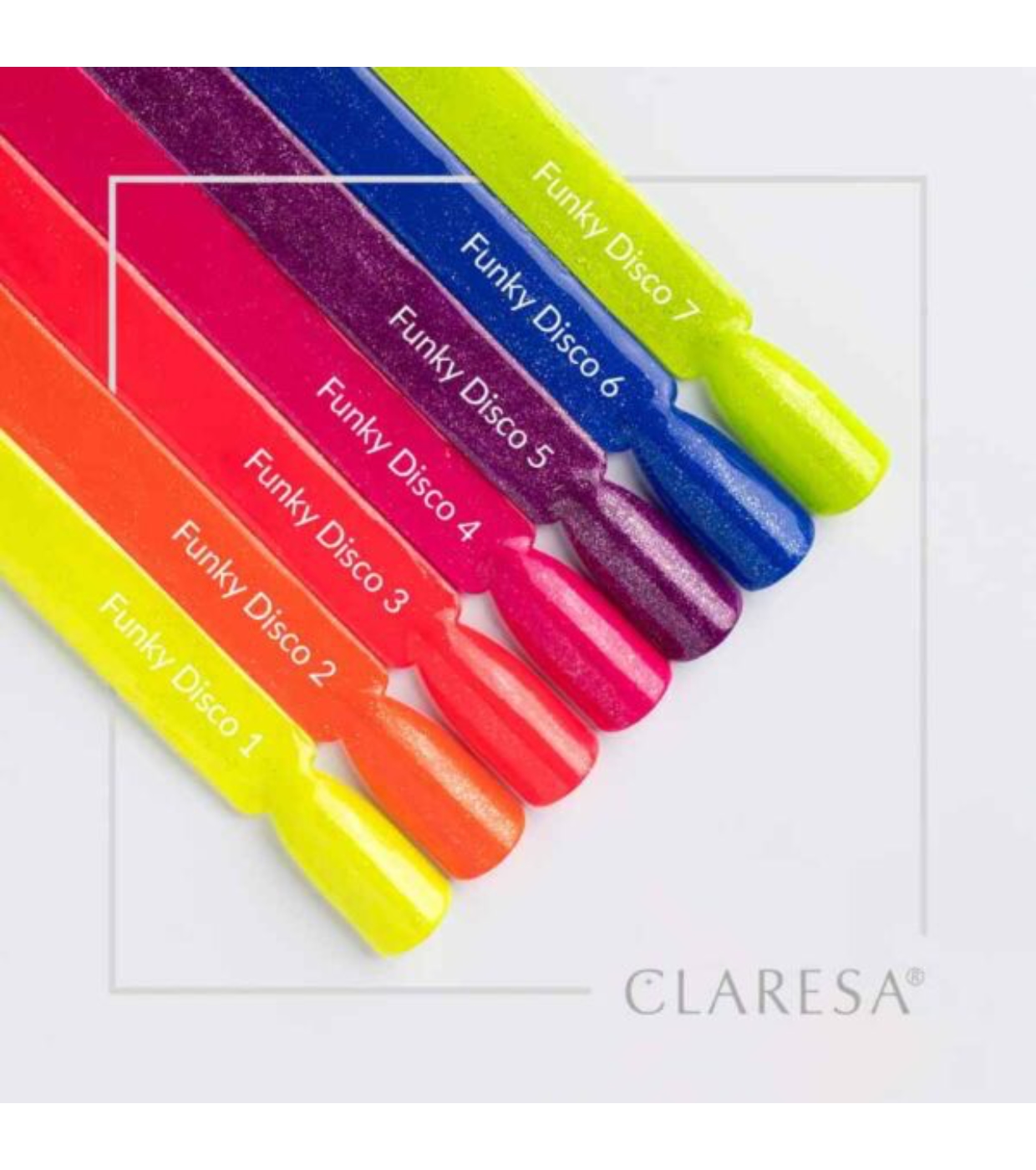 La collection Funky Disco de Claresa comprend 7 vernis à ongles semi-permanents aux nuances vibrantes de rose, orange, jaune, vert, bleu et violet, tous ornés de milliers de particules scintillantes.