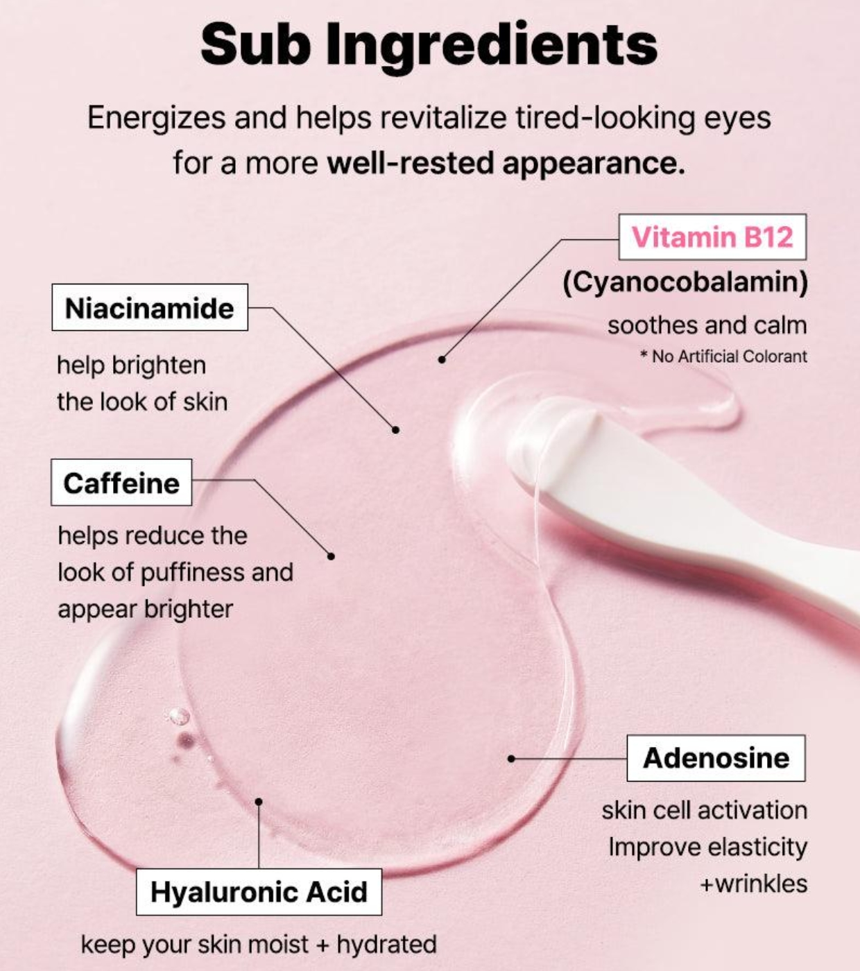 Water, Dipropylene Glycol, Glycerin, Niacinamide, Ceratonia Siliqua (Carob) Gum, Chondrus Crispus Powder, Chondrus Crispus, Cellulose Gum, Hydroxyacetophenone, Algin, Caprylyl Glycol, Potassium Chloride, Betaine, Panthenol, Sucrose, Ethylhexylglycerin, Sodium Polyacrylate Polyglyceryl-10 Laurate, Adenosine, Polyglyceryl-10 Myristate, Maltodextrin, Caffeine, Collagen, Butylene Glycol, Cyanocobalamin, 1,2-Hexanediol, Sodium Hyaluronate, Dipotassium Glycyrrhizate, Pantolactone, Pentylene Glycol, Acetyl Hexapeptide-8, Dunaliella Salina Extract, shPolypeptide-121, Palmitoyl Tripeptide-5, Hydrolyzed Hyaluronic Acid, Hyaluronic Acid, Potassium Hyaluronate, Hydrolyzed Sodium Hyaluronate, Acetyl Tetrapeptide-5, Citric Acid, Disodium EDTA