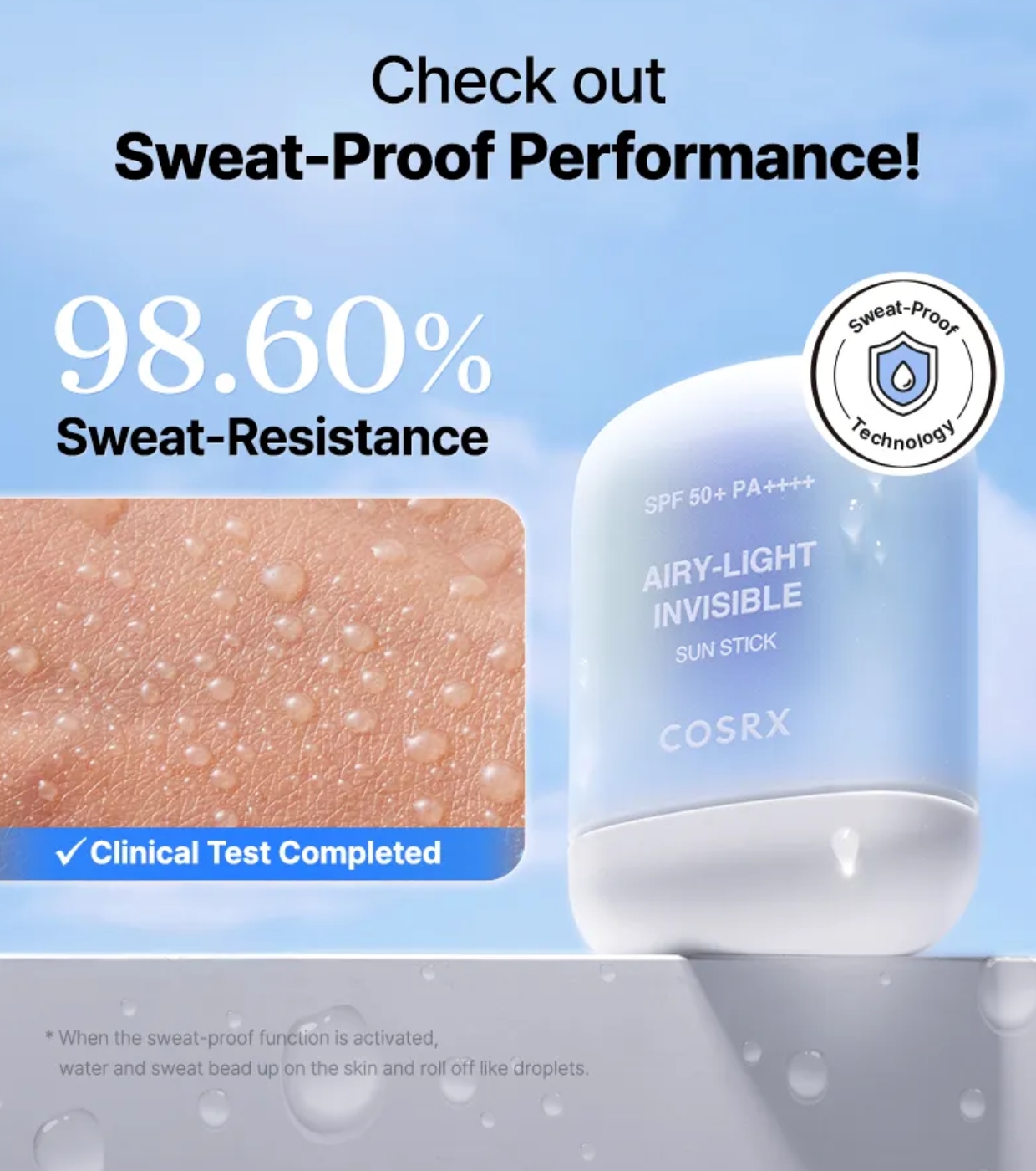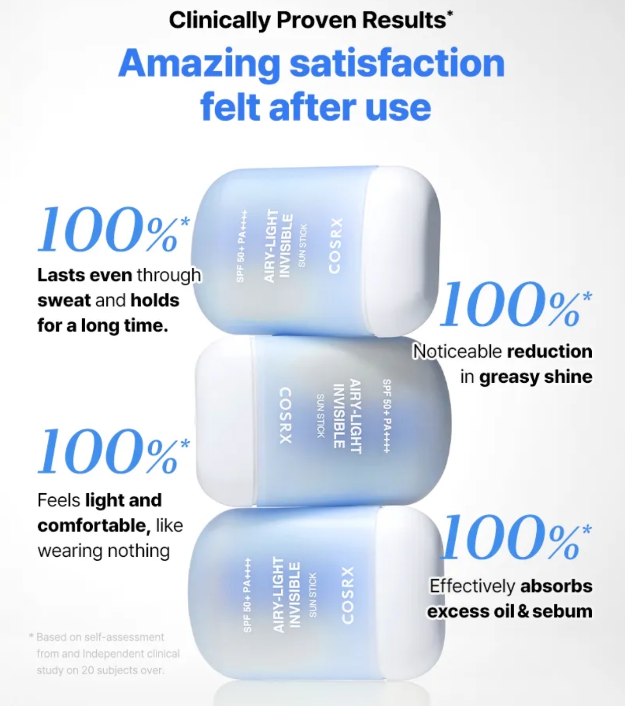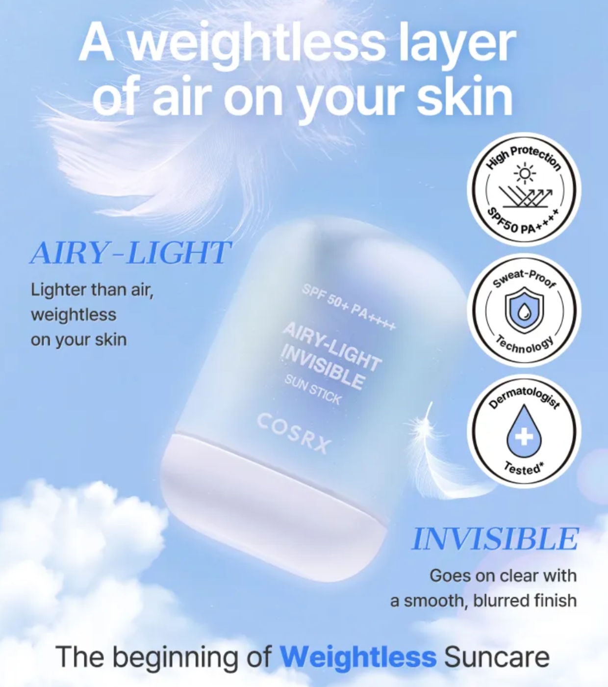 Le Airy-Light Invisible Sun Stick de COSRX est un stick solaire avec SPF50+ PA++++, conçu pour offrir une très haute protection UV avec une texture douce et légère qui est imperceptible sur la peau.