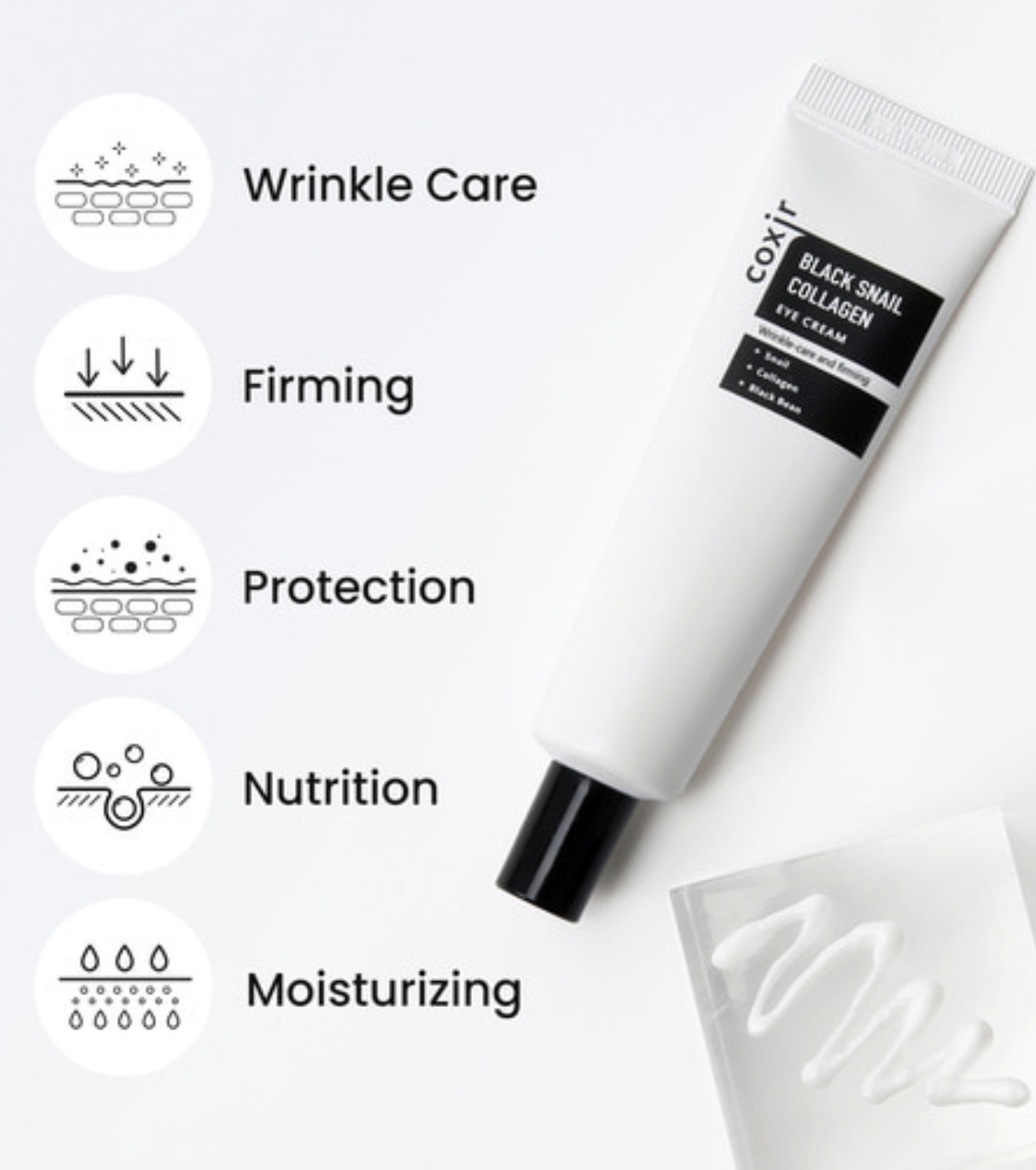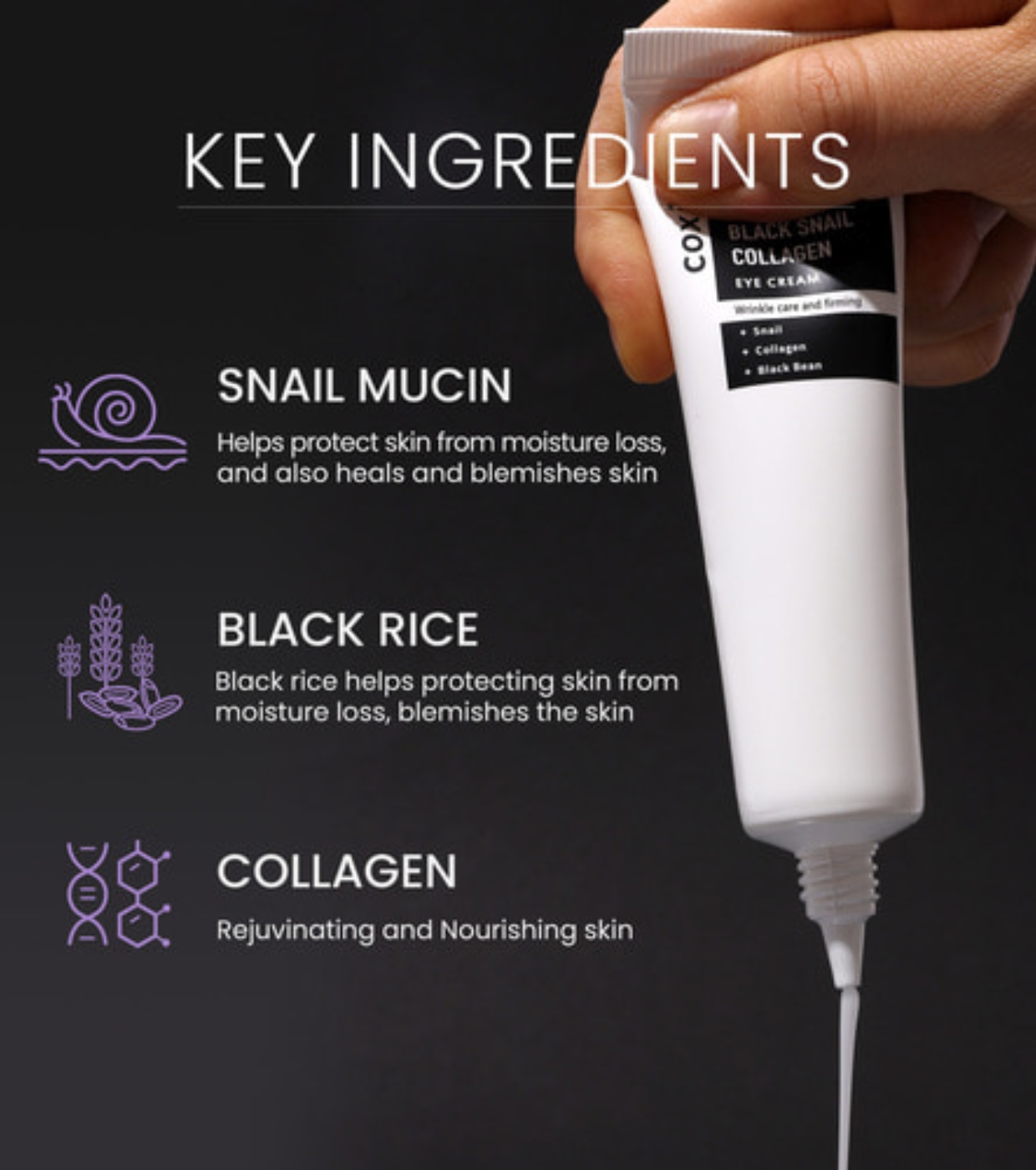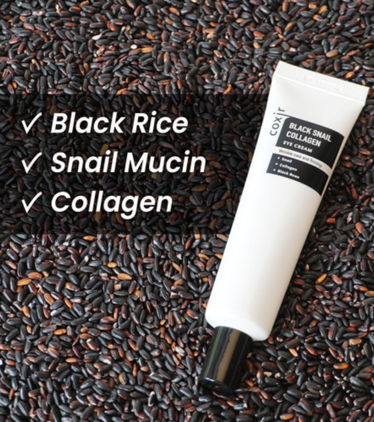 Ce contour des yeux associant le Black Snail Collagen de COXIR associe de la bave d'escargot, du collagène et des extraits antioxydants de haricot noir, de sésame noir et de riz noir pour offrir un soin complet de la zone délicate du contour des yeux.