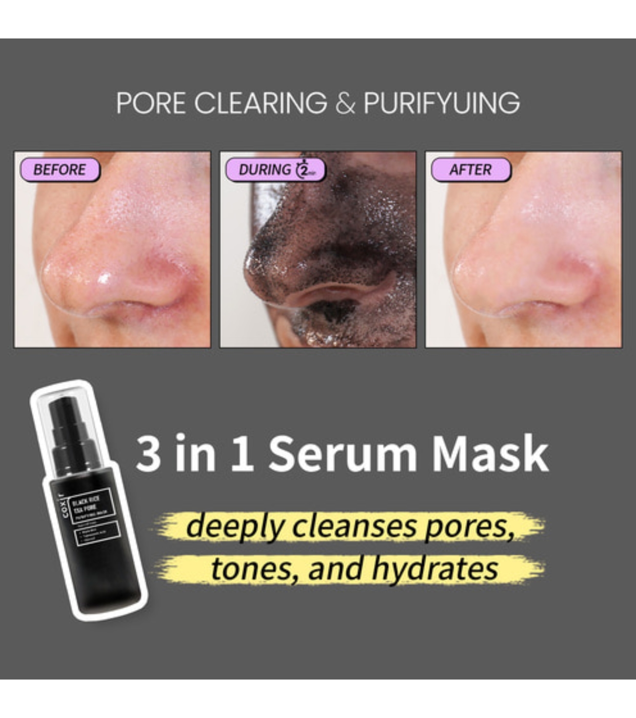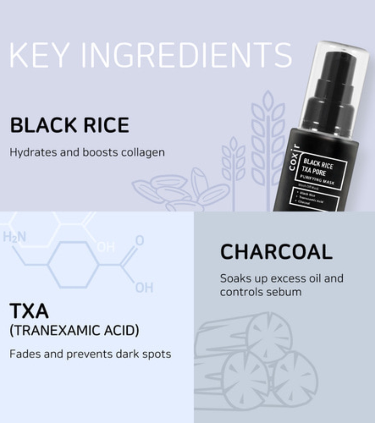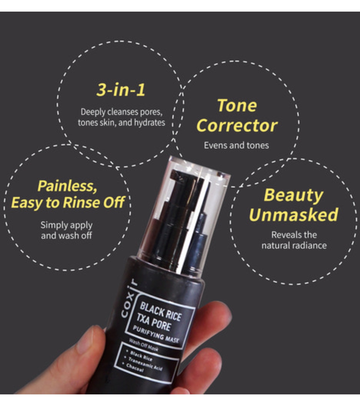 Profitez d'un nettoyage en profondeur et d'un teint plus uniforme avec ce masque facial purifiant Black Rise Txa Pore de COXIR , à base de charbon actif et de riz noir.