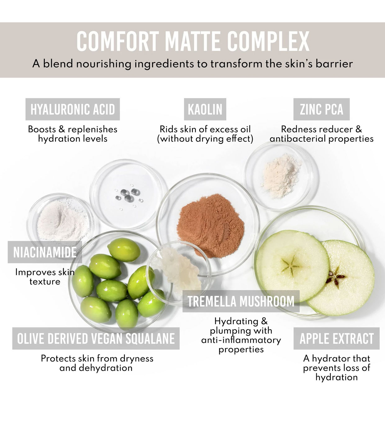 AGUA/AQUA/EAU, SÍLICE, PROPANEDIOL, GLICERINA, EXTRACTO DE FRUTA DE PYRUS MALUS (MANZANA), ÁCIDO HIALURÓNICO, CAOLÍN, NIACINAMIDA, ZINC PCA, ESCUALANO, EXTRACTO DE TREMELLA FUCIFORMIS (HONGO), GLUCONOLACTONA, GALACTOARABINANO, GLUCONADO DE CALCIO, POLIACRILATO CROSSPOLYMER- 6 , SORBATO DE POTASIO, ETILHEXILGLICERINA, BENZOATO DE SODIO, ALÚMINA, (+/-): DIÓXIDO DE TITANIO (CI 77891), ÓXIDOS DE HIERRO (CI 77491)