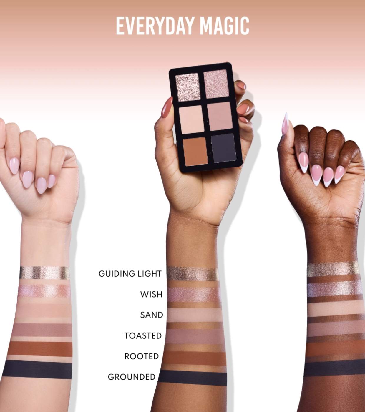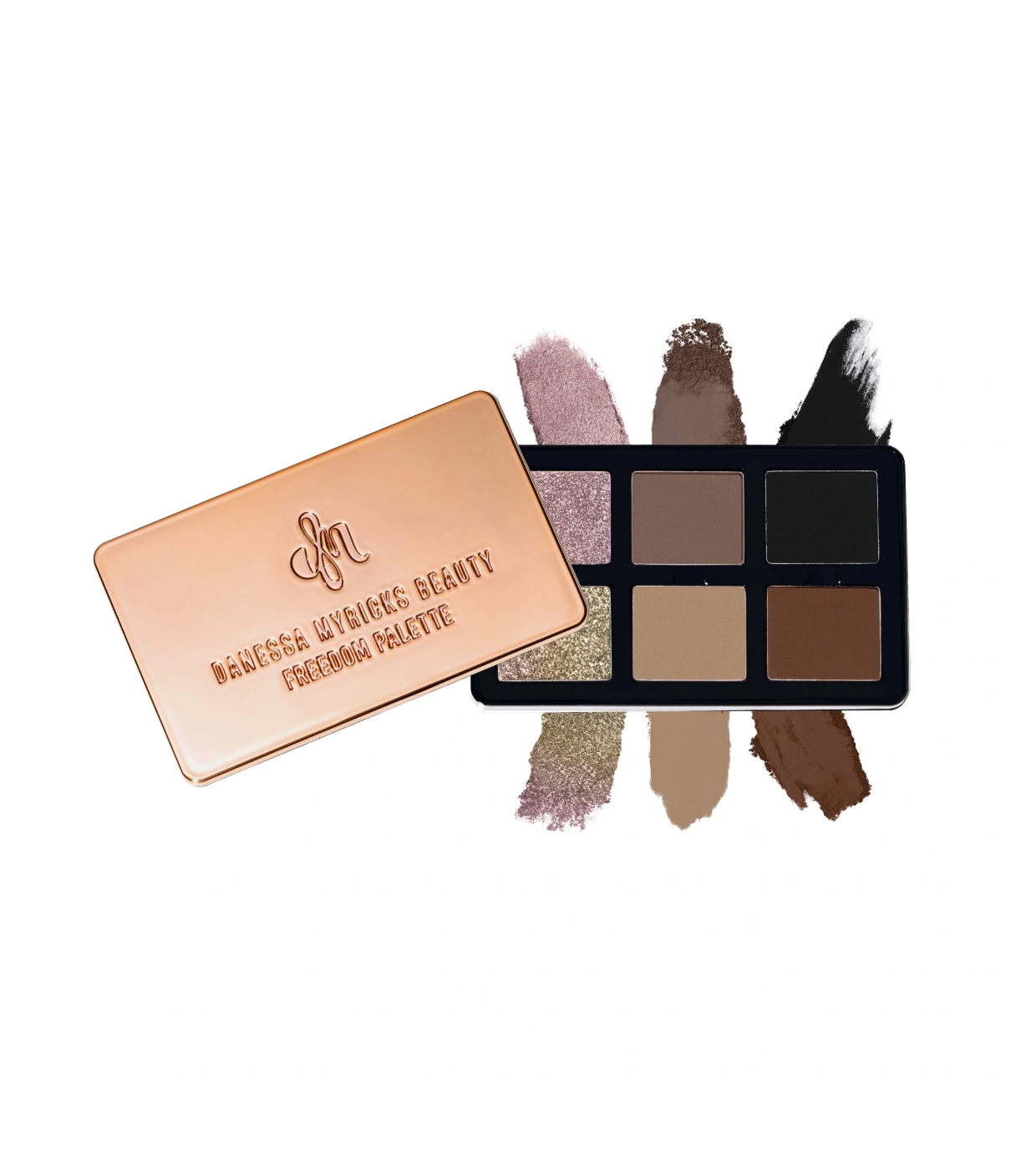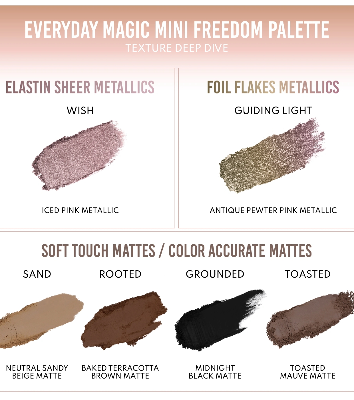 Cette palette réunit six teintes essentielles aux finis magiques : un top coat nacré ultra-réfléchissant et dynamique, un métallisé chromé à fort impact et quatre teintes de base mates à la pigmentation précise et facile à travailler.