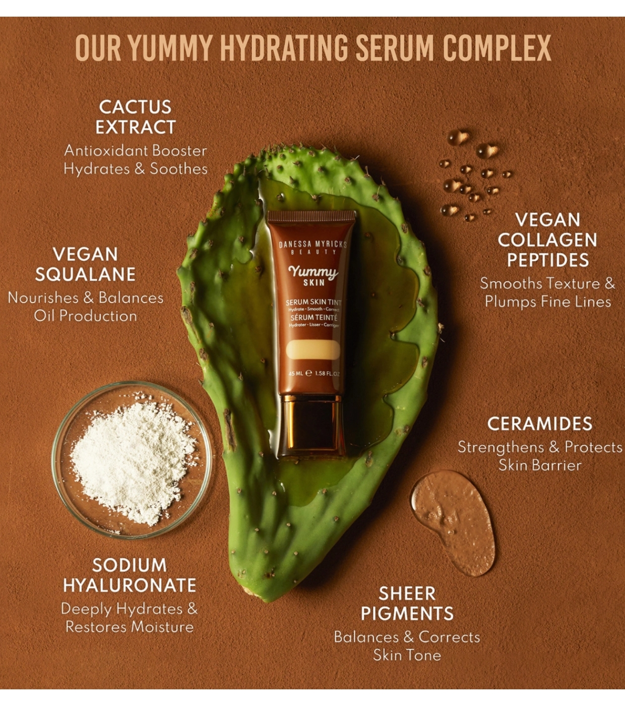 Le sérum est une combinaison d'ingrédients correcteurs, hydratants et lissants avec du Hyaluronate de Sodium pour hydrater en profondeur et restaurer l'hydratation, des Peptides de Collagène Vegan pour lisser la texture et combler les ridules, des Céramides pour renforcer, réparer et protéger la barrière cutanée, de l'extrait de cactus antioxydant pour hydrater et du squalane végétalien lisse pour nourrir et hydrater, et des pigments transparents pour équilibrer et corriger le teint de la peau.