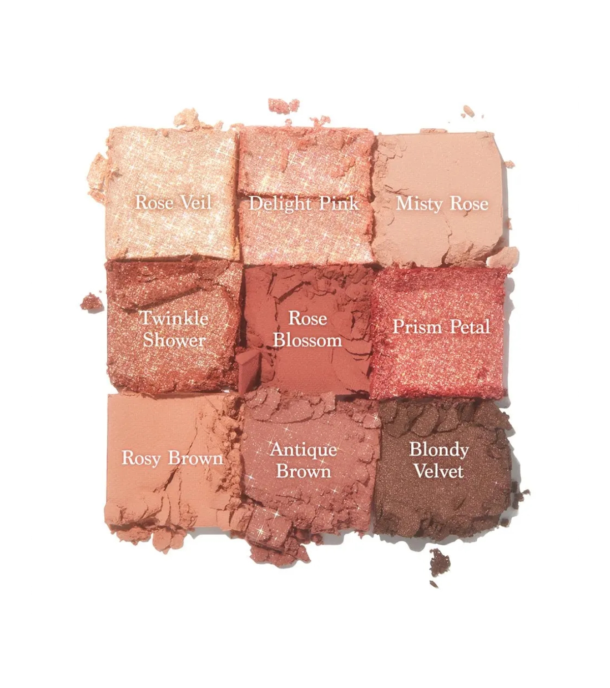 1 Rose Veil- Dimethicone, Synthetic Fluorphlogopite, Calcium Titanium Borosilicate, Calcium Aluminum Borosilicate, Methyl Methacrylate Crosspolymer, Titanium Dioxide (CI 77891), Neopentyl Glycol Diethylhexanoate, Hexyl Laurate, Dimethicone/Vinyl Dimethicone Crosspolymer, Mica, Nylon-12, Diglyceryl Sebacate/Isopalmitate, Sorbitan Sesquiisostearate, Silica, Magnesium Myristate, Dipentaerythrityl Hexahydroxystearate/Hexastearate/Hexarosinate, Phenoxyethanol, Propanediol, Synthetic Wax, Kaolin, Tocopherol, Iron Oxides (CI 77491), Tin Oxide, Carmine (CI 75470), Manganese Violet (CI 77742) 2 Delight Pink- Dimethicone, Calcium Titanium Borosilicate, Synthetic Fluorphlogopite, Methyl Methacrylate Crosspolymer, Titanium Dioxide (CI 77891), Neopentyl Glycol Diethylhexanoate, Mica, Hexyl Laurate, Dimethicone/Vinyl Dimethicone Crosspolymer, Nylon-12, Diglyceryl Sebacate/Isopalmitate, Sorbitan Sesquiisostearate, Magnesium Myristate, Dipentaerythrityl Hexahydroxystearate/Hexastearate/Hexarosinate, Propanediol, Phenoxyethanol, Synthetic Wax, Maltodextrin, Kaolin, Tocopherol, Iron Oxides (CI 77491), Carmine (CI 75470), Tin Oxide, Manganese Violet (CI 77742), Yellow 5 Lake (CI 19140) 3 Misty Rose- Talc, Mica, Titanium Dioxide (CI 77891), Nylon-12, Silica, Neopentyl Glycol Diethylhexanoate, Phenyl Trimethicone, Dimethicone, Magnesium Myristate, Magnesium Stearate, Methylpropanediol, Macadamia Ternifolia Seed Oil, Diisostearyl Malate, Dipentaerythrityl Hexahydroxystearate/Hexastearate/Hexarosinate, Isostearyl Neopentanoate, Octyldodecyl Stearoyl Stearate, Propanediol, Polybutene, Lauroyl Lysine, Aluminum Hydroxide, Hydrogenated Lecithin, Methicone, Triethoxycaprylylsilane, Iron Oxides (CI 77491), Ultramarines (CI 77007), Iron Oxides (CI 77499), Iron Oxides (CI 77492) 4 Twinkle Shower- Talc, Calcium Aluminum Borosilicate, Calcium Titanium Borosilicate, Calcium Sodium Borosilicate, Titanium Dioxide (CI 77891), Mica, Neopentyl Glycol Diethylhexanoate, Nylon-12, Phenyl Trimethicone, Dipentaerythrityl Hexahydroxystearate/Hexastearate/Hexarosinate, Magnesium Myristate, Silica, Iron Oxides (CI 77491), Octyldodecyl Stearoyl Stearate, Isostearyl Neopentanoate, Diisostearyl Malate, Magnesium Stearate, Methyl Methacrylate Crosspolymer, Methylpropanediol, Polybutene, Propanediol, Dimethicone, Lauroyl Lysine, Triethoxycaprylylsilane, Maltodextrin, Tin Oxide, Iron Oxides (CI 77499), Carmine (CI 75470), Iron Oxides (CI 77492) 5 Rose Blossom- Talc, Mica, Silica, Nylon-12, Carmine (CI 75470), Titanium Dioxide (CI 77891), Phenyl Trimethicone, Octyldodecyl Stearoyl Stearate, Iron Oxides (CI 77491), Boron Nitride, Magnesium Stearate, Dimethicone, Magnesium Myristate, Methylpropanediol, HDI/Trimethylol Hexyllactone Crosspolymer, Iron Oxides (CI 77499), Macadamia Ternifolia Seed Oil, Iron Oxides (CI 77492), Propanediol, Ultramarines (CI 77007), Maltodextrin, Lauroyl Lysine, Aluminum Hydroxide, Methicone, Triethoxycaprylylsilane 6 Prism Petal- Calcium Titanium Borosilicate, Calcium Aluminum Borosilicate, Talc, Triethylhexanoin, Calcium Sodium Borosilicate, Titanium Dioxide (CI 77891), Polyglyceryl-2 Triisostearate, Nylon-12, Mica, Carmine (CI 75470), Magnesium Myristate, Hydrogenated Castor Oil Isostearate, Magnesium Stearate, Methylpropanediol, Propanediol, Iron Oxides (CI 77491), Ultramarines (CI 77007), Tin Oxide, Maltodextrin, Yellow 5 Lake (CI 19140), Dimethicone, Lauroyl Lysine, Vinyl Dimethicone/Methicone Silsesquioxane Crosspolymer, Triethoxycaprylylsilane, Iron Oxides (CI 77499) 7 Rosy Brown- Talc, Mica, Silica, Octyldodecanol, Octyldodecyl Stearoyl Stearate, Phenyl Trimethicone, Carmine (CI 75470), Magnesium Myristate, Methylpropanediol, Nylon-12, Iron Oxides (CI 77491), HDI/Trimethylol Hexyllactone Crosspolymer, Dimethicone, Macadamia Ternifolia Seed Oil, Yellow 5 Lake (CI 19140), Dipentaerythrityl Hexahydroxystearate/Hexastearate/Hexarosinate, Dimethiconol Stearate, Magnesium Stearate, Propanediol, Iron Oxides (CI 77492), Diisostearyl Malate, Titanium Dioxide (CI 77891), Iron Oxides (CI 77499), Hydrogenated Lecithin, Triethoxycaprylylsilane, Maltodextrin, Ultramarines (CI 77007), Aluminum Hydroxide, Methicone 8 Antique Brown- Mica, Talc, Manganese Violet (CI 77742), Calcium Aluminum Borosilicate, Octyldodecanol, Silica, Diisostearyl Malate, Titanium Dioxide (CI 77891), Nylon-12, Iron Oxides (CI 77492), Iron Oxides (CI 77491), Dimethicone, Magnesium Myristate, Methylpropanediol, Carmine (CI 75470), Dipentaerythrityl Hexahydroxystearate/Hexastearate/Hexarosinate, Macadamia Ternifolia Seed Oil, Magnesium Stearate, Propanediol, Iron Oxides (CI 77499), Kaolin, Triethoxycaprylylsilane, Ultramarines (CI 77007), Tin Oxide, Maltodextrin, Aluminum Hydroxide, Methicone 9 Blondy Velvet- Mica, Talc, Iron Oxides (CI 77491), Triethylhexanoin, Titanium Dioxide (CI 77891), Synthetic Fluorphlogopite, Polyglyceryl-2 Triisostearate, Iron Oxides (CI 77499), Nylon-12, Iron Oxides (CI 77492), Hydrogenated Castor Oil Isostearate, Carmine (CI 75470), Silica, Methylpropanediol, Magnesium Myristate, Magnesium Stearate, Propanediol, Dimethicone, Triethoxycaprylylsilane, Ultramarines (CI 77007), Lauroyl Lysine, Maltodextrin, Tin Oxide, Ferric Ferrocyanide (CI 77510)