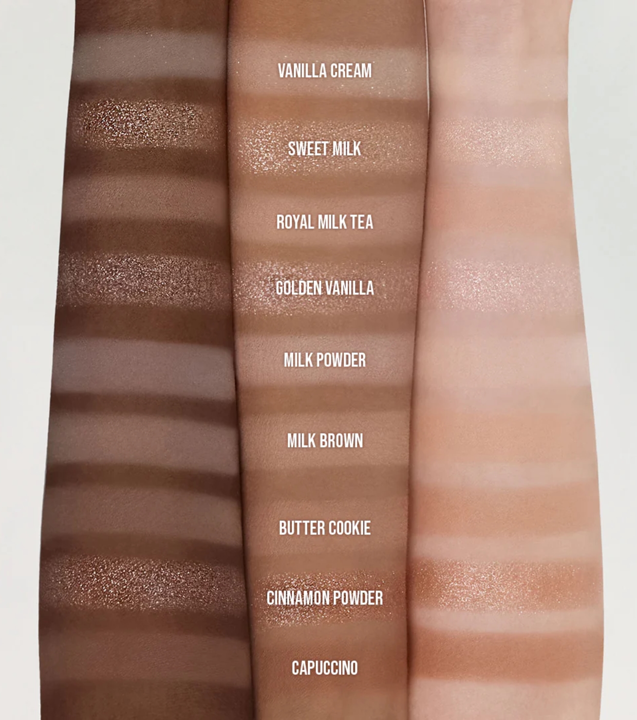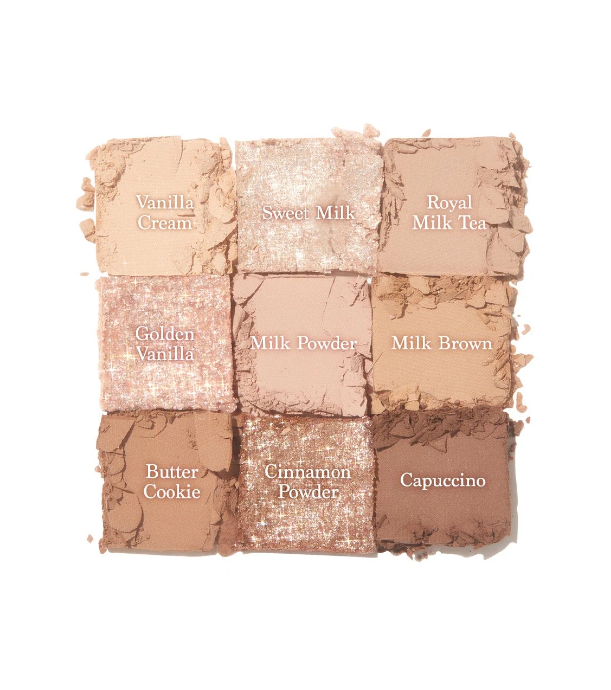 01 Vanilla Cream-Talc, Mica, Polypropylene, Triethylhexanoin, Calcium Titanium Borosilicate, Titanium Dioxide (CI 77891), Aluminum Starch Octenylsuccinate, Pentaerythrityl Tetraethylhexanoate, Dimethicone, Zinc Stearate, Caprylyl Glycol, Ethylhexylglycerin, Iron Oxides (CI 77492), Triethoxycaprylylsilane, PCA Dimethicone, Iron Oxides (CI 77491), Iron Oxides (CI 77499), Aluminum Hydroxide, Methicone, Tin Oxide, Tocopherol 02 Sweet Milk- Calcium Titanium Borosilicate, Diphenylsiloxy Phenyl Trimethicone, Polypropylene, Calcium Aluminum Borosilicate, Phytosteryl/Isostearyl/Cetyl/Stearyl/Behenyl Dimer Dilinoleate, Titanium Dioxide (CI 77891), Hydrogenated Castor Oil Dimer Dilinoleate, Diisostearyl Malate, Octyldodecanol, Zinc Stearate, Polymethylsilsesquioxane, Mica, Silica, Disteardimonium Hectorite, Tin Oxide, Ethylhexylglycerin, Caprylyl Glycol, Propylene Carbonate, Iron Oxides (CI 77491), Carmine (CI 75470), Tocopherol 03 Royal Milk Tea- Talc, Mica, Polypropylene, Triethylhexanoin, Aluminum Starch Octenylsuccinate, Titanium Dioxide (CI 77891), Ultramarines (CI 77007), Pentaerythrityl Tetraethylhexanoate, Dimethicone, Iron Oxides (CI 77492), Iron Oxides (CI 77491), Zinc Stearate, Caprylyl Glycol, Ethylhexylglycerin, Triethoxycaprylylsilane, PCA Dimethicone, Iron Oxides (CI 77499), Kaolin, Aluminum Hydroxide, Methicone, Carmine (CI 75470), Maltodextrin, Tocopherol 04 Golden Vanilla- Calcium Titanium Borosilicate, Diphenylsiloxy Phenyl Trimethicone, Polybutylene Terephthalate, Polypropylene, Phytosteryl/Isostearyl/Cetyl/Stearyl/Behenyl Dimer Dilinoleate, Titanium Dioxide (CI 77891), Hydrogenated Castor Oil Dimer Dilinoleate, Ethylene/Va Copolymer, Acrylates Copolymer, Diisostearyl Malate, Octyldodecanol, Mica, Disteardimonium Hectorite, Ethylhexylglycerin, Tin Oxide, Zinc Stearate, Caprylyl Glycol, Iron Oxides (CI 77491), Propylene Carbonate, Carmine (CI 75470), Tocopherol 05 Milk Powder- Talc, Mica, Polypropylene, Triethylhexanoin, Titanium Dioxide (CI 77891), Aluminum Starch Octenylsuccinate, Pentaerythrityl Tetraethylhexanoate, Ultramarines (CI 77007), Dimethicone, Zinc Stearate, Caprylyl Glycol, Ethylhexylglycerin, Iron Oxides (CI 77491), Triethoxycaprylylsilane, PCA Dimethicone, Iron Oxides (CI 77499), Iron Oxides (CI 77492), Kaolin, Aluminum Hydroxide, Methicone, Tocopherol 06 Milk Brown- Talc, Mica, Polypropylene, Triethylhexanoin, Aluminum Starch Octenylsuccinate, Pentaerythrityl Tetraethylhexanoate, Titanium Dioxide (CI 77891), Dimethicone, Iron Oxides (CI 77492), Iron Oxides (CI 77491), Zinc Stearate, Caprylyl Glycol, Ethylhexylglycerin, Triethoxycaprylylsilane, PCA Dimethicone, Iron Oxides (CI 77499), Aluminum Hydroxide, Methicone, Tocopherol 07 Butter Cookie- Talc, Mica, Polypropylene, Triethylhexanoin, Titanium Dioxide (CI 77891), Aluminum Starch Octenylsuccinate, Iron Oxides (CI 77492), Iron Oxides (CI 77491), Pentaerythrityl Tetraethylhexanoate, Iron Oxides (CI 77499), Dimethicone, Zinc Stearate, Caprylyl Glycol, Ethylhexylglycerin, Yellow 5 Lake (CI 19140), Triethoxycaprylylsilane, PCA Dimethicone, Aluminum Hydroxide, Methicone, Carmine (CI 75470), Maltodextrin, Tocopherol 08 Cinnamon Powder- Calcium Titanium Borosilicate, Diphenylsiloxy Phenyl Trimethicone, Calcium Aluminum Borosilicate, Phytosteryl/Isostearyl/Cetyl/Stearyl/Behenyl Dimer Dilinoleate, Polypropylene, Hydrogenated Castor Oil Dimer Dilinoleate, Diisostearyl Malate, Titanium Dioxide (CI 77891), Octyldodecanol, Zinc Stearate, Mica, Iron Oxides (CI 77491), Silica, Polymethylsilsesquioxane, Tin Oxide, Disteardimonium Hectorite, Ethylhexylglycerin, Caprylyl Glycol, Propylene Carbonate, Tocopherol 09 Cappuccino- Talc, Mica, Polypropylene, Triethylhexanoin, Iron Oxides (CI 77492), Aluminum Starch Octenylsuccinate, Titanium Dioxide (CI 77891), Iron Oxides (CI 77499), Iron Oxides (CI 77491), Pentaerythrityl Tetraethylhexanoate, Dimethicone, Zinc Stearate, Caprylyl Glycol, Ethylhexylglycerin, Triethoxycaprylylsilane, PCA Dimethicone, Carmine (CI 75470), Aluminum Hydroxide, Methicone, Maltodextrin, Tocopherol