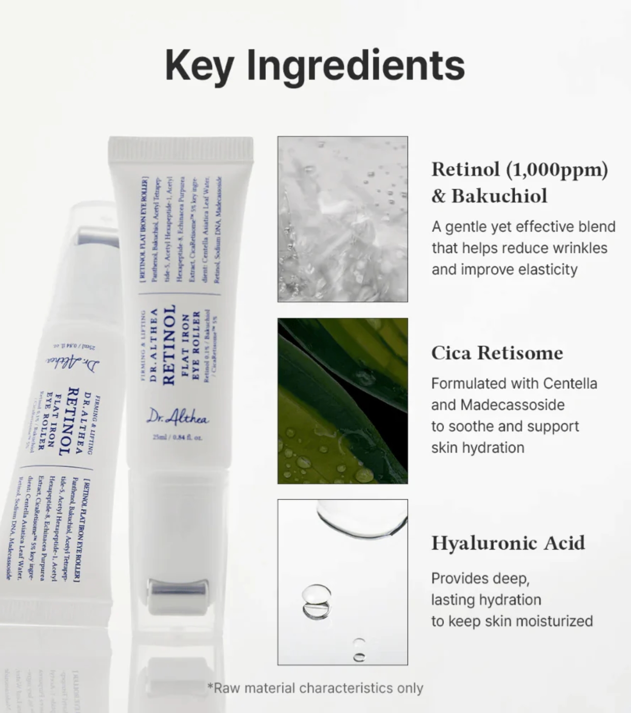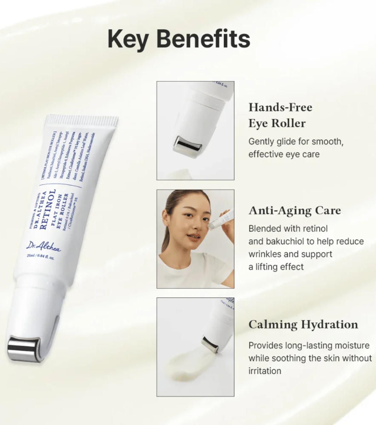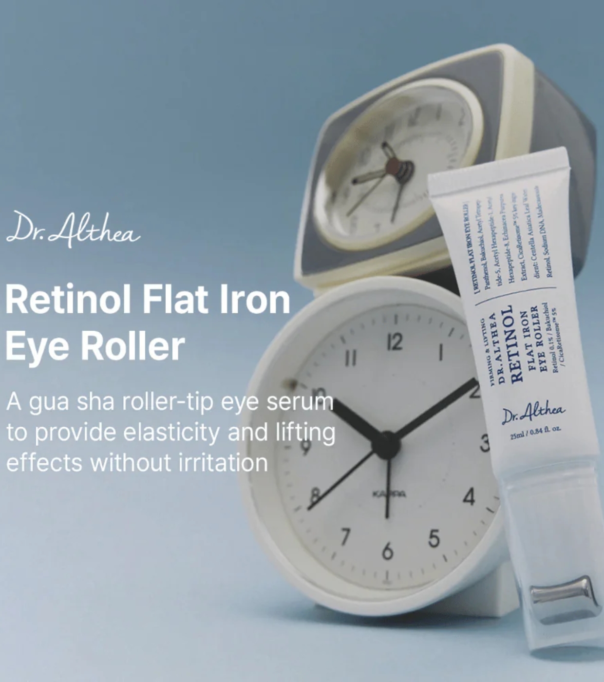 Le Retinol Flat Iron Eye Roller de Dr. Althea est un soin spécifique pour le contour des yeux qui combine des actifs anti-âge et apaisants pour améliorer la fermeté, lisser les rides et hydrater une zone particulièrement délicate.