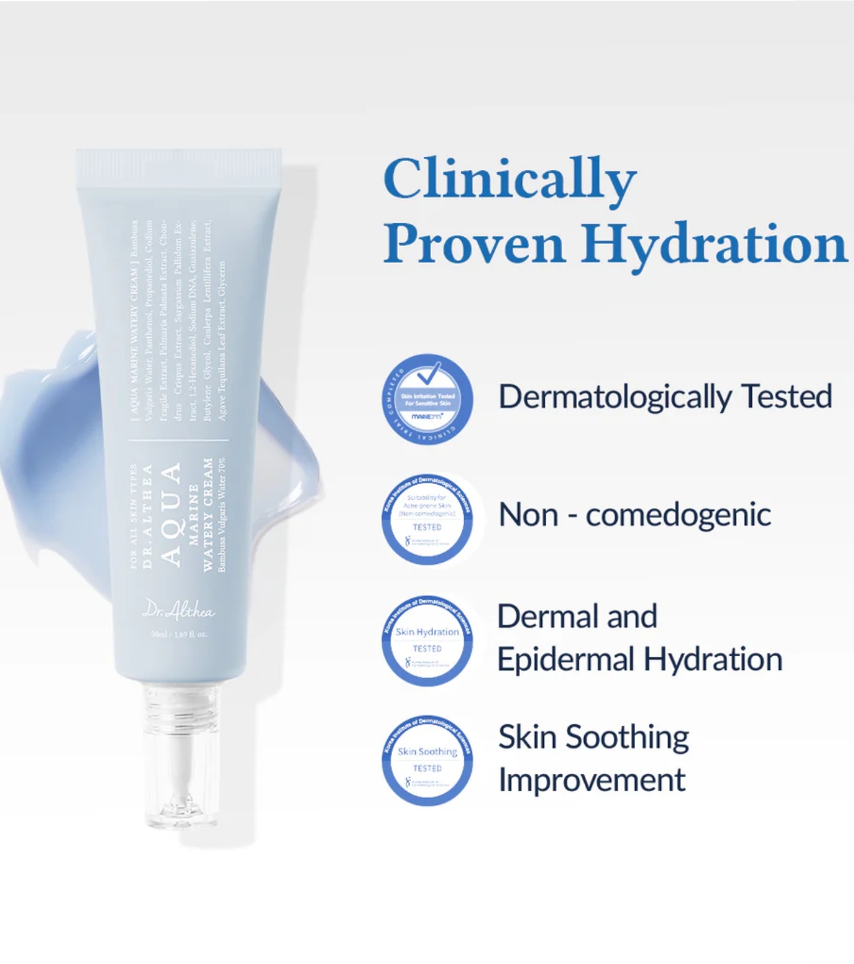 Découvrez une hydratation instantanée, fraîche et revitalisante dès la première application avec Dr. Althea Aqua Marine Watery Cream , une crème visage ultra-légère, semblable à de l'eau, qui pénètre rapidement et laisse la peau douce, équilibrée et profondément hydratée, sans sensation de lourdeur.