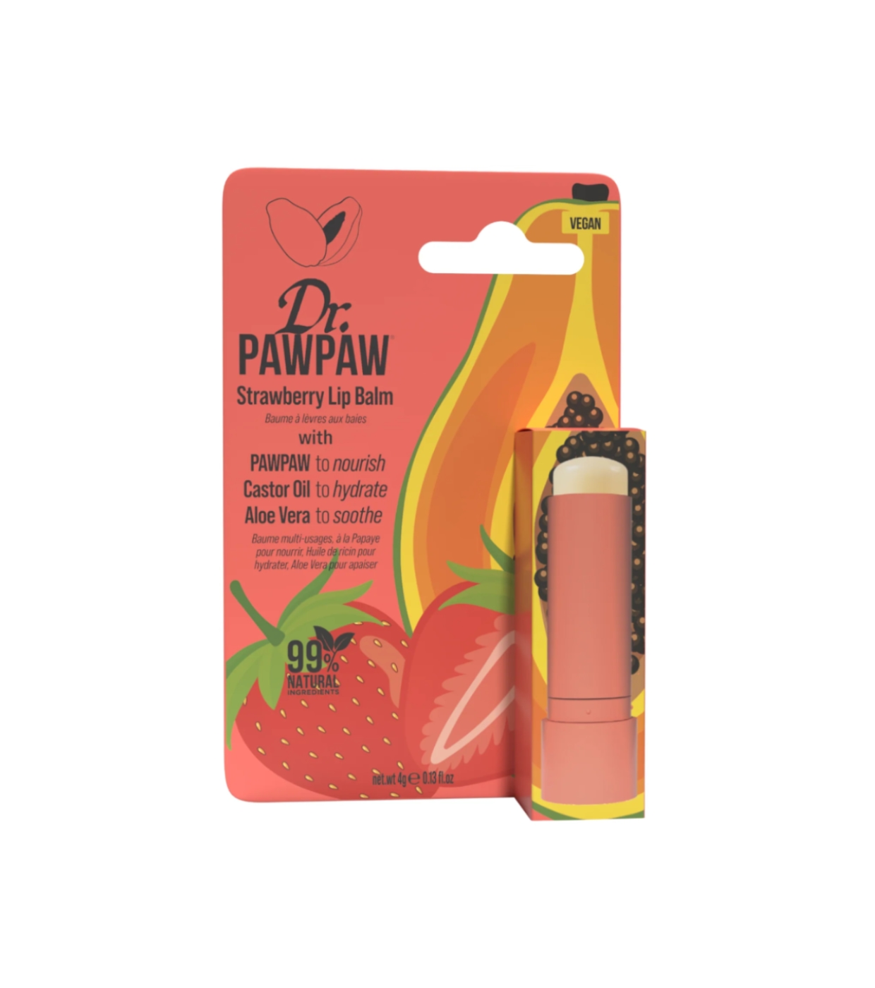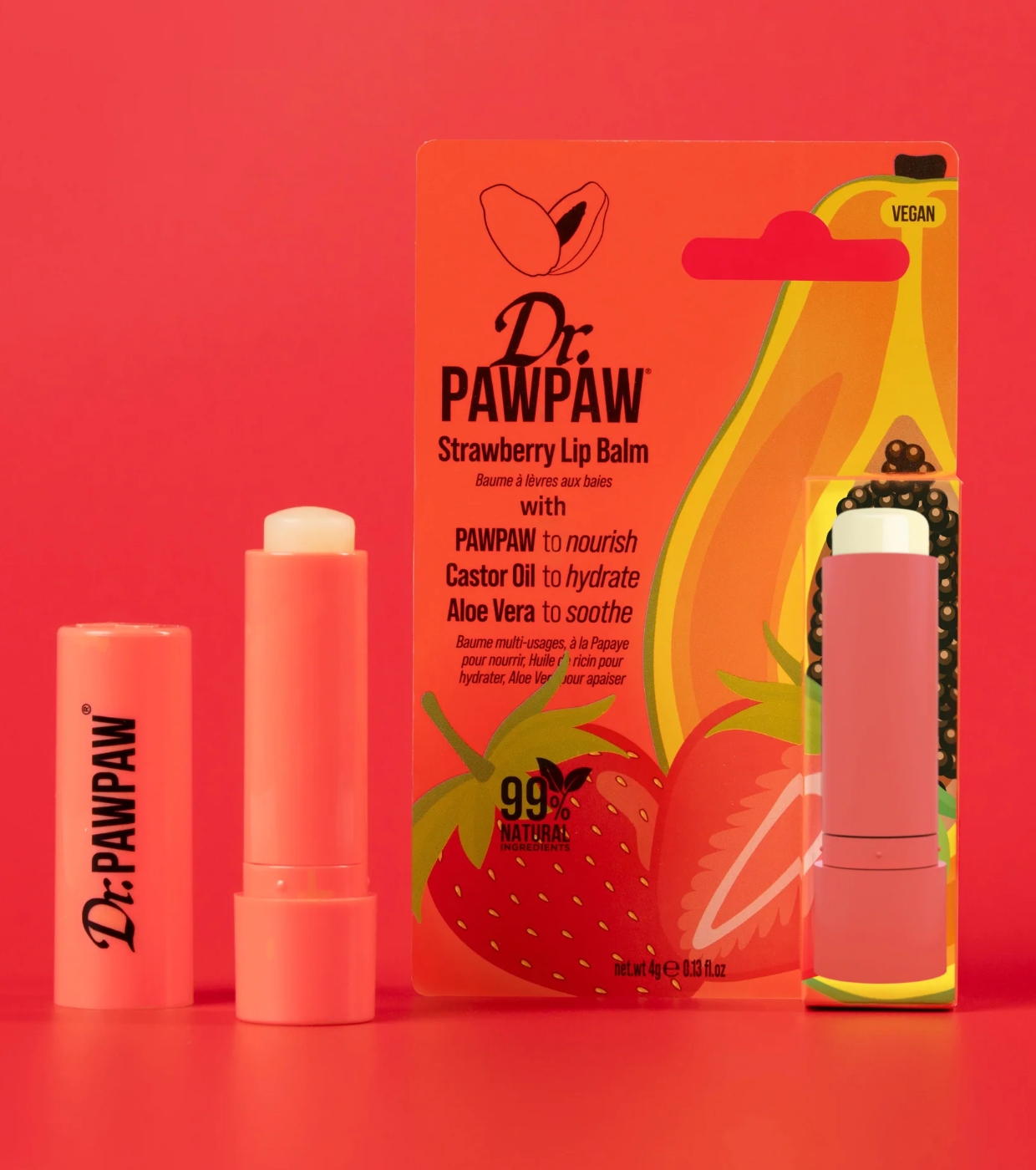 Strawberry Le baume à lèvres en stick à la fraise est bien plus qu'un hydratant : c'est un baume miracle végétalien à 99 % naturel, parfait pour nourrir, adoucir et protéger vos lèvres avec un délicieux parfum de fraise juteuse.