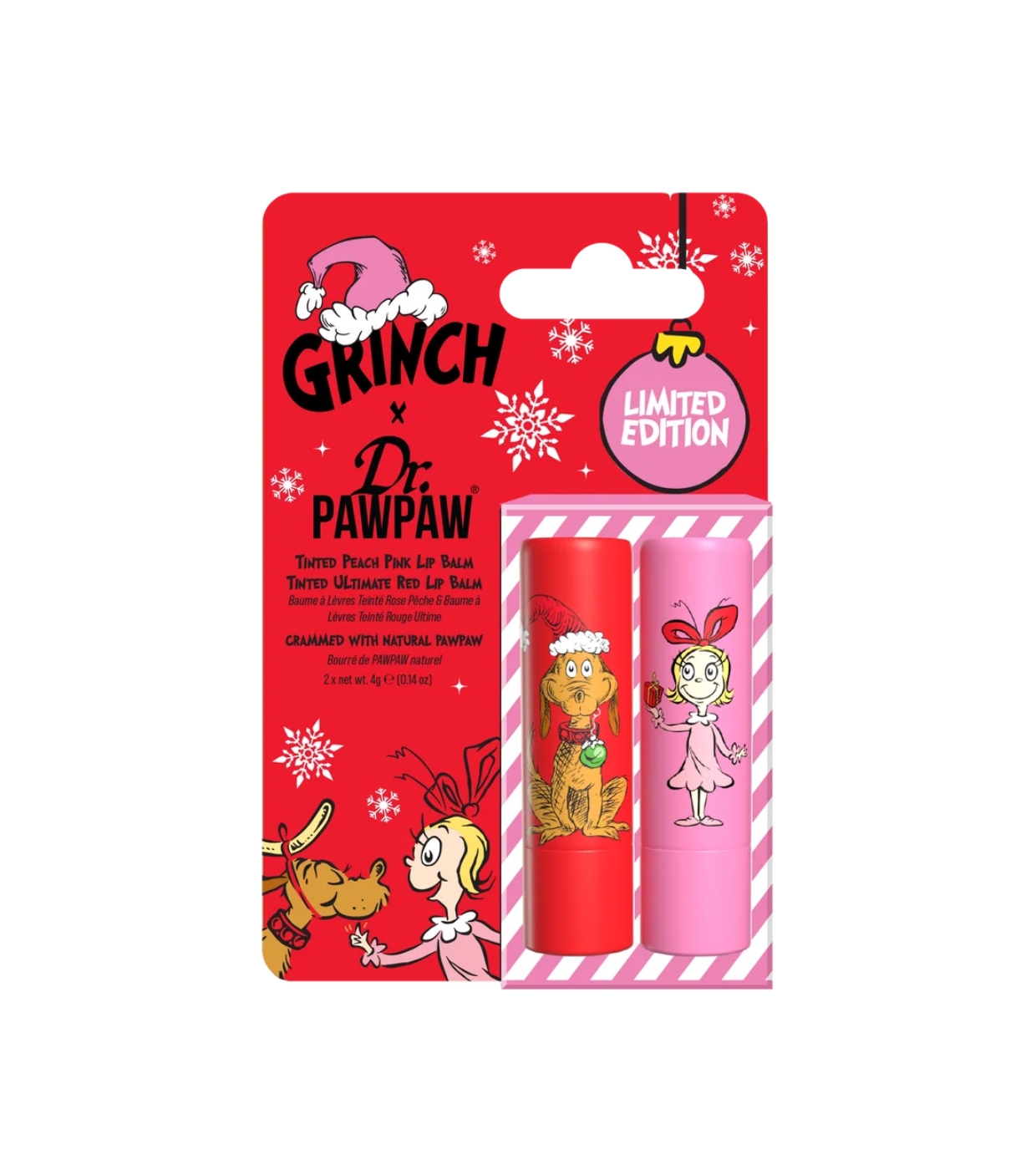 Whoville est plus espiègle que jamais ! Découvrez le duo teinté Grinch x Dr.PAWPAW, un duo amusant de baumes à lèvres teintés conçus pour hydrater, adoucir et apporter une touche festive de couleur à vos lèvres.
