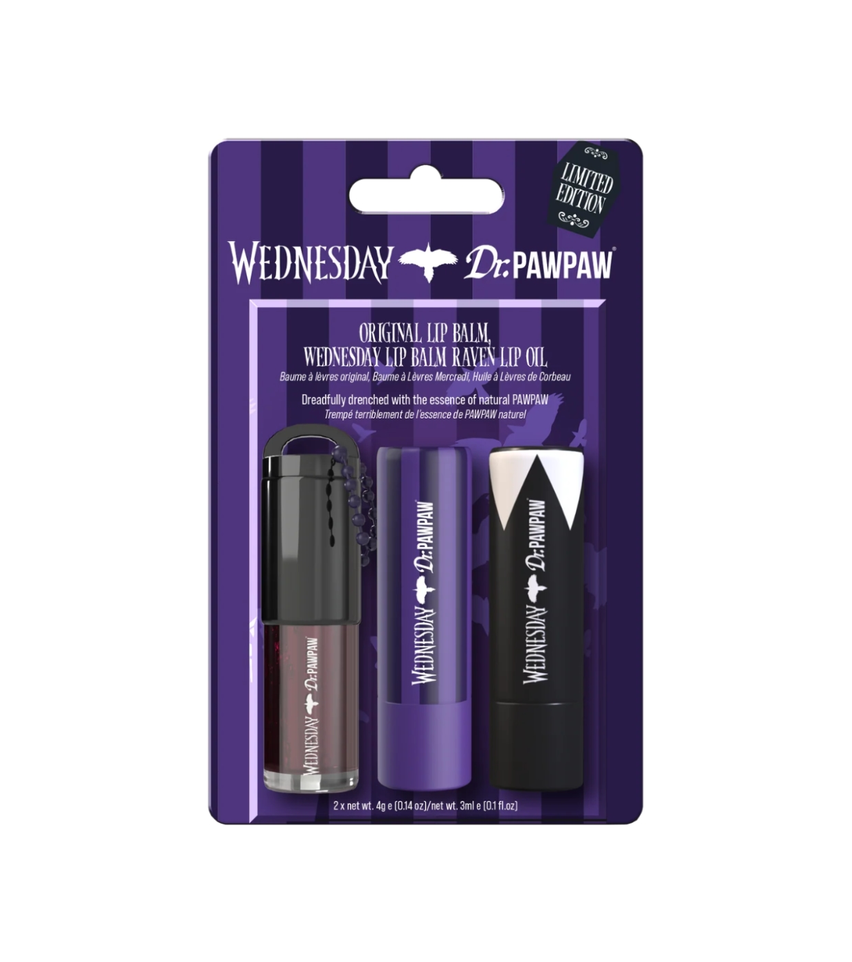 Pour celles qui se sentent plus à l'aise dans l'ombre, le trio de baumes à lèvres et d'huile à lèvres Dr.PAWPAW est arrivé, une édition inspirée par le style mystérieux et élégant de Wednesday.