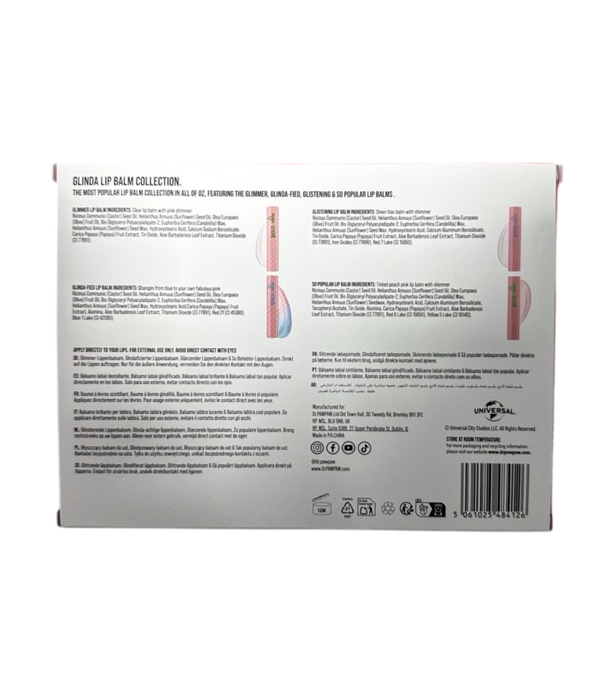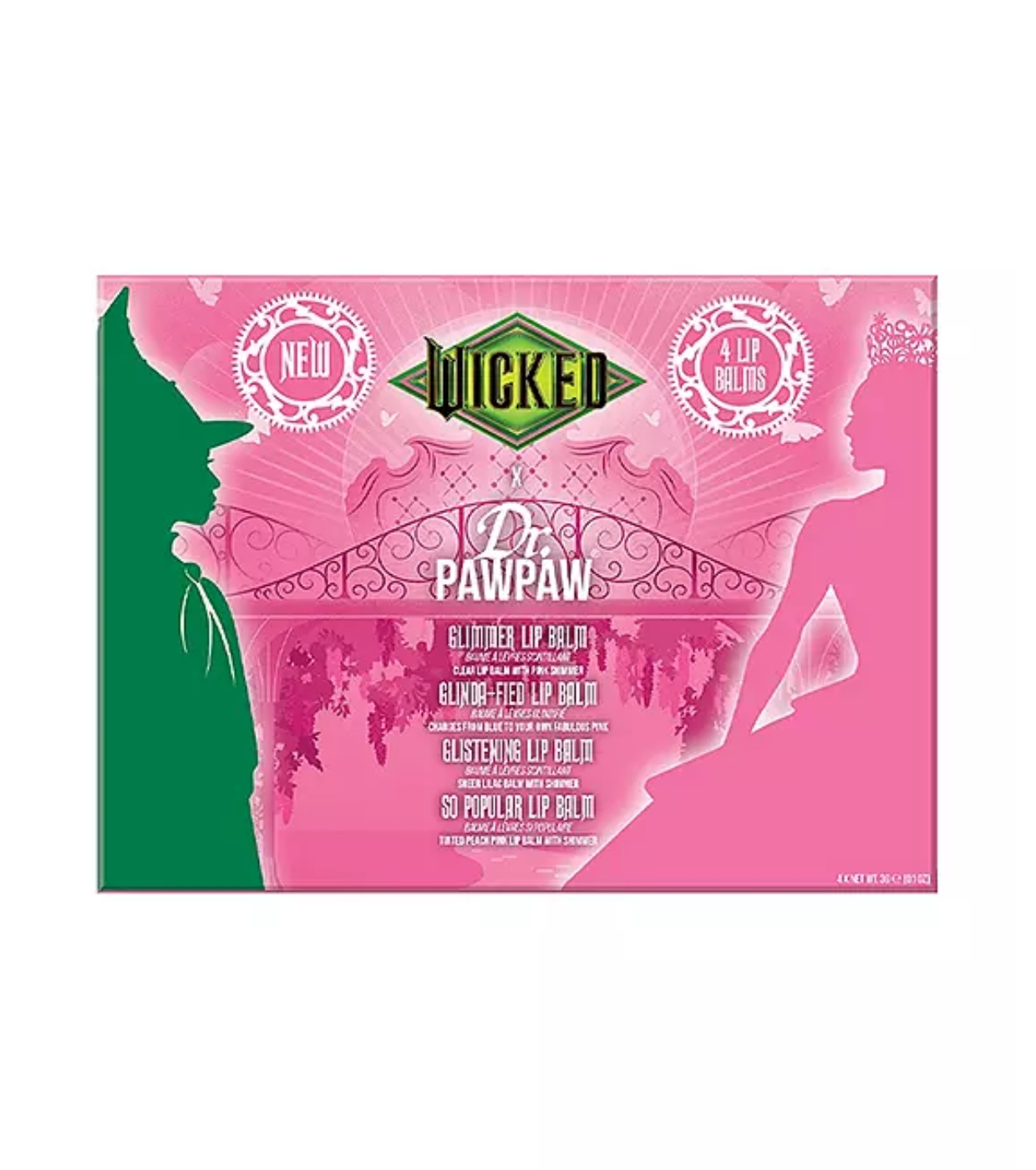 Découvrez la magie de l'univers Wicked x Dr.PAWPAW avec ce coffret exclusif de 4 baumes à lèvres , une collection inspirée par le charme, la lumière et l'essence brillante de Glinda.