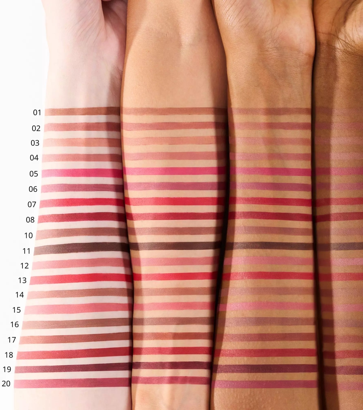 Sa formule crémeuse, onctueuse et résistante à l'eau offre une couleur intense dès le premier passage et un fini mat longue tenue, jusqu'à 8 heures, sans dessécher.